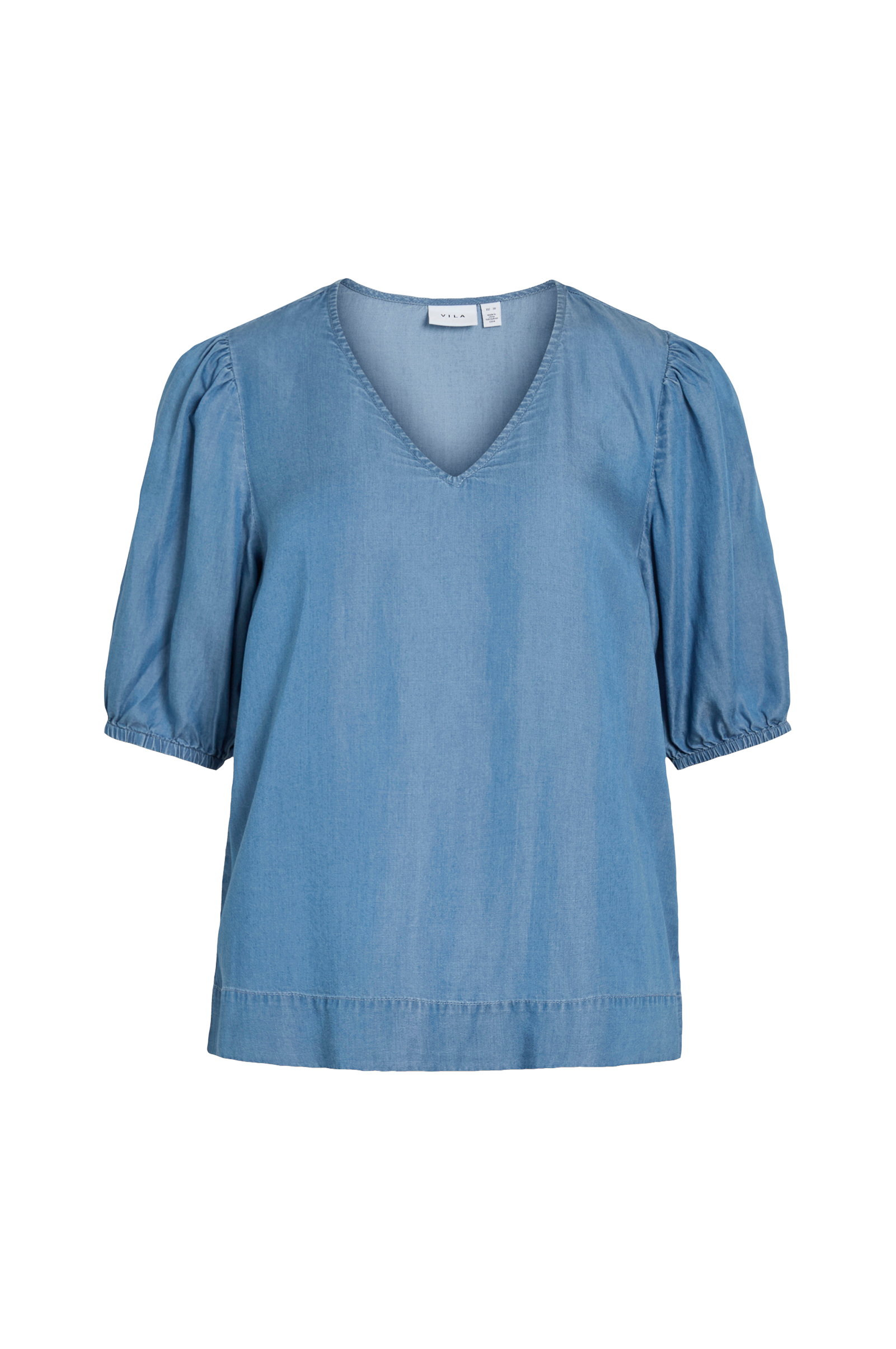 • Bluse i blødt denim• V-udskæring• Korte ballonærmer