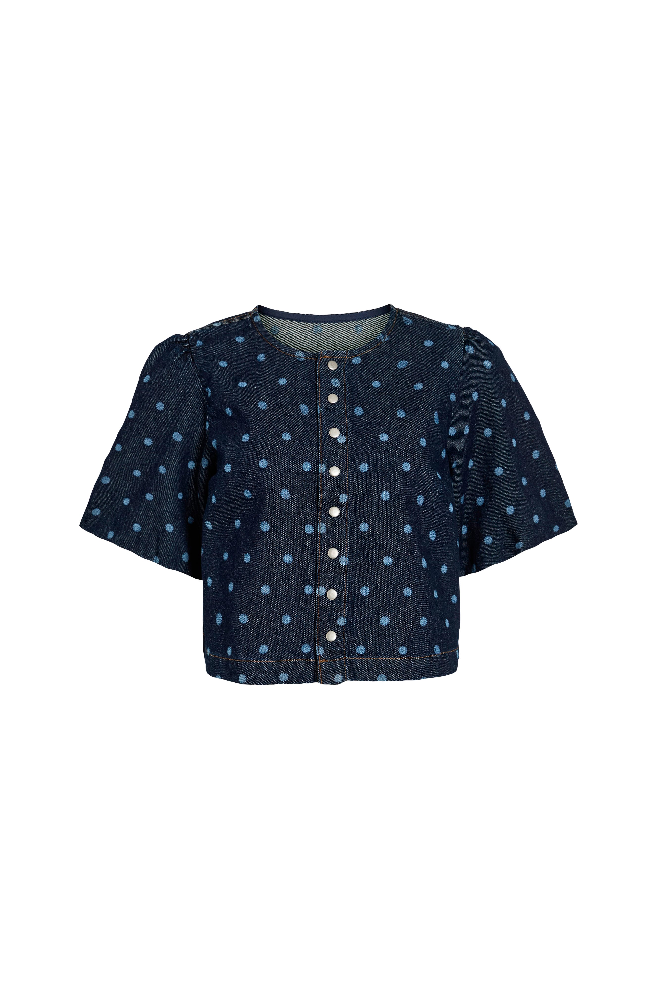 • Bluse i bomuldsdenim• Rund halsudskæring• Korte ballonærmer• Trykknapper foran