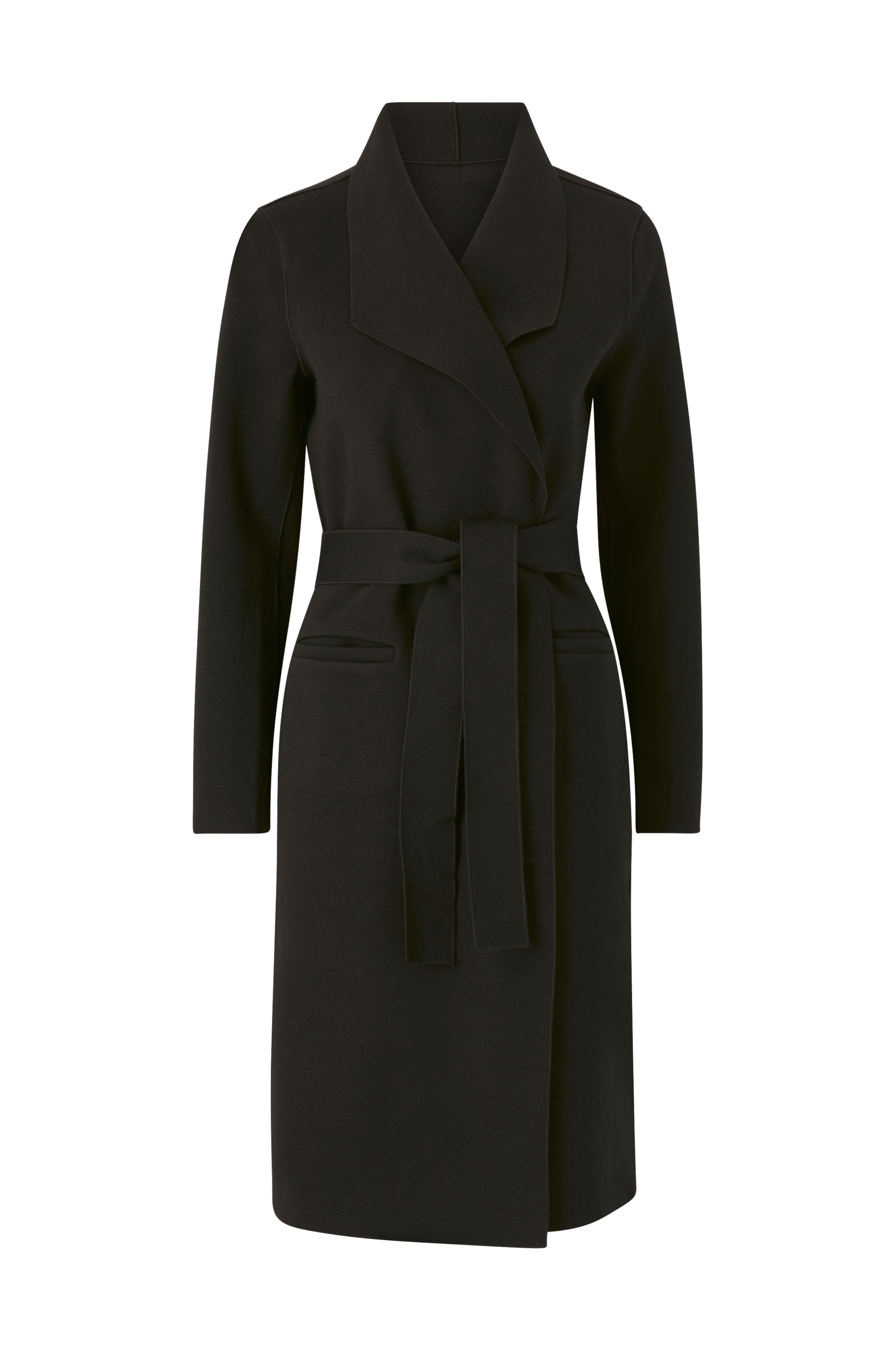 V frakke i tynd stretchkvalitet med en side med glat struktur og den anden side med et noget blødere, filtet look. Åben model med bindebælte i taljen og lommer foran. Længde ca. 112 cm i str. S.