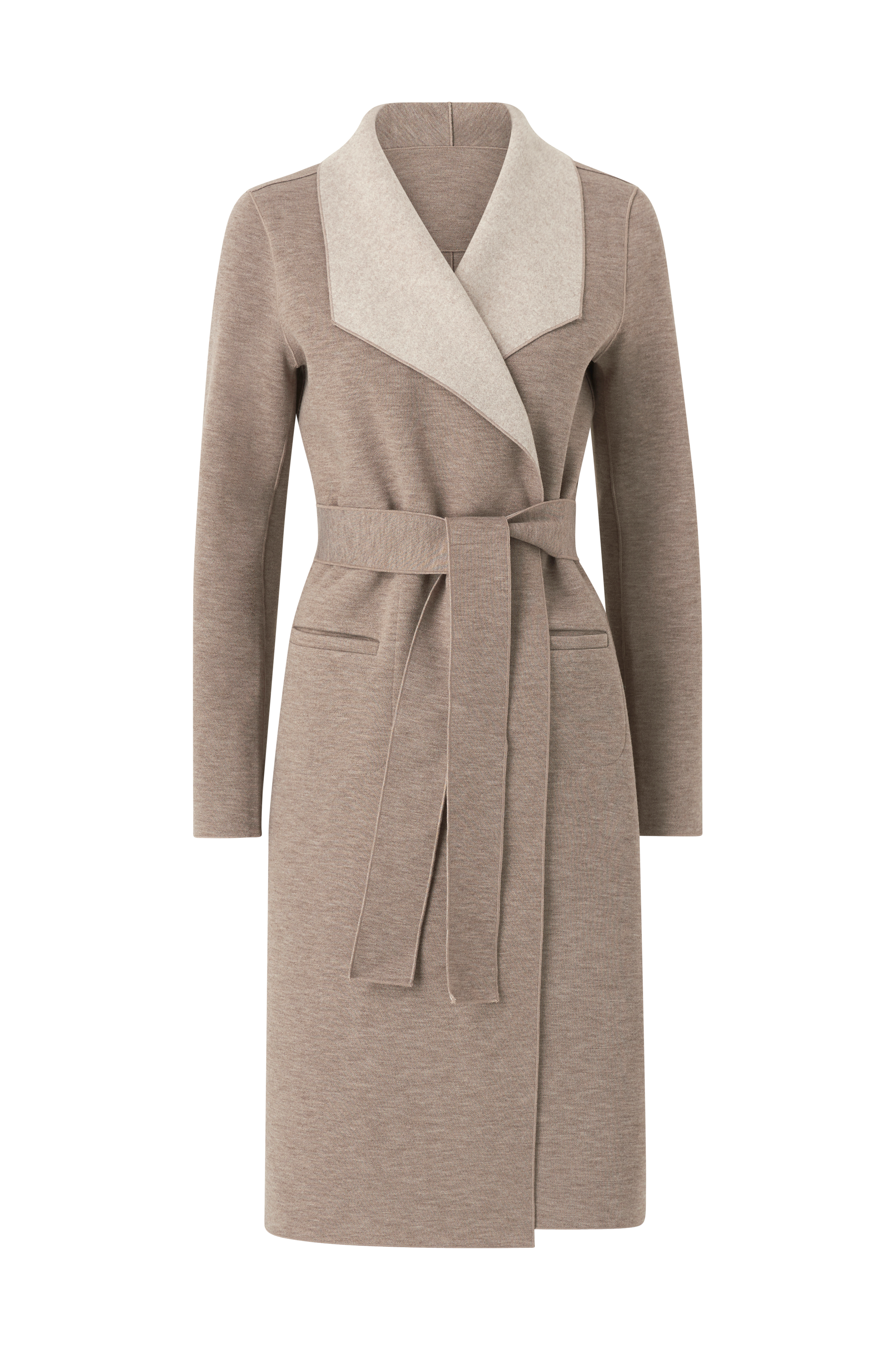 V frakke i tynd stretchkvalitet med en side med glat struktur og den anden side med et noget blødere, filtet look. Åben model med bindebælte i taljen og lommer foran. Længde ca. 112 cm i str. S.