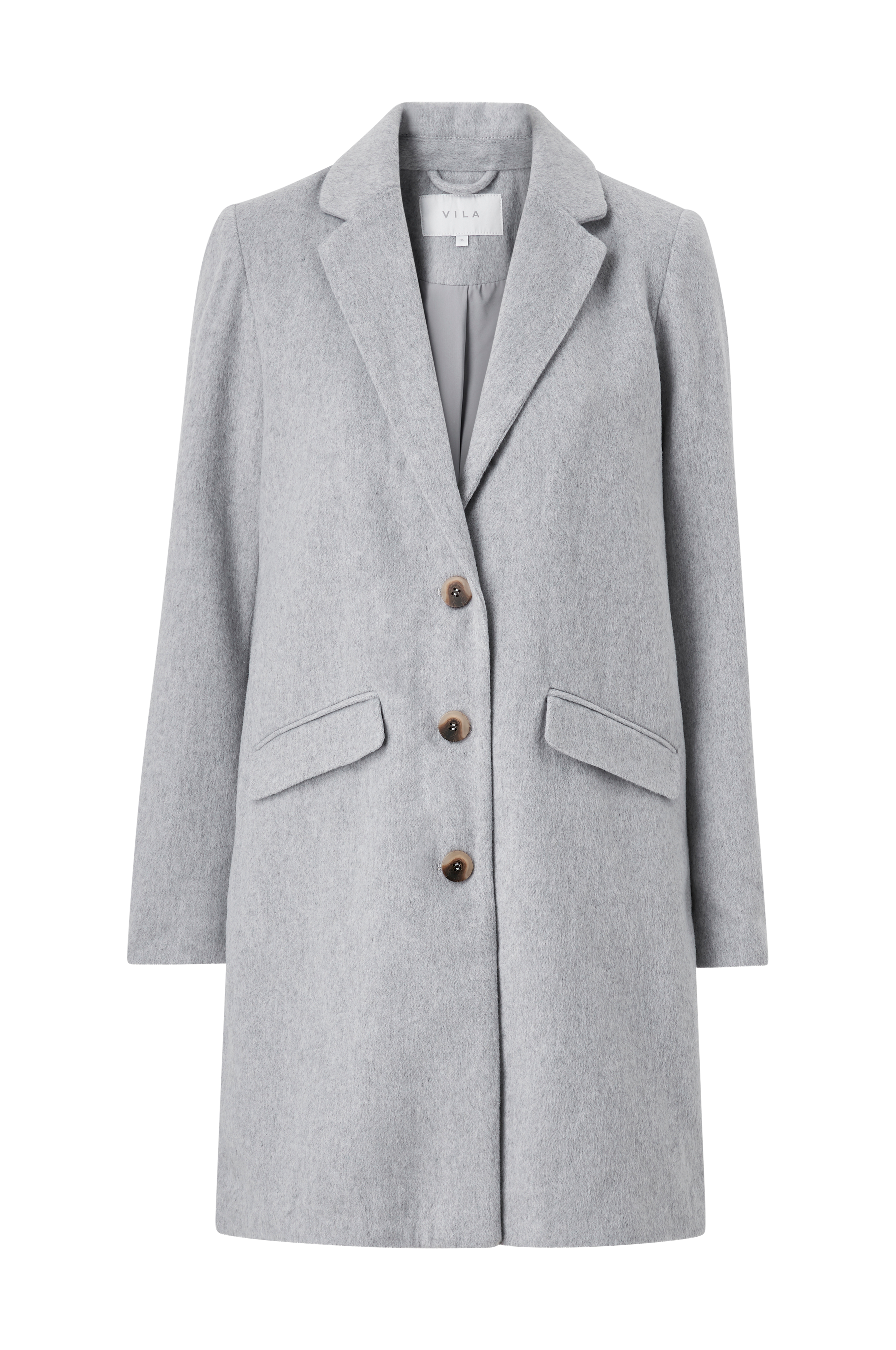 Frakke viLeovita Coat fra Vila. Lige model med krave og revers samt tre knapper foran. Indvendige skulderpuder og to indsatte paspolerede lommer med klap. Længde ca. 92 cm i str. 36.