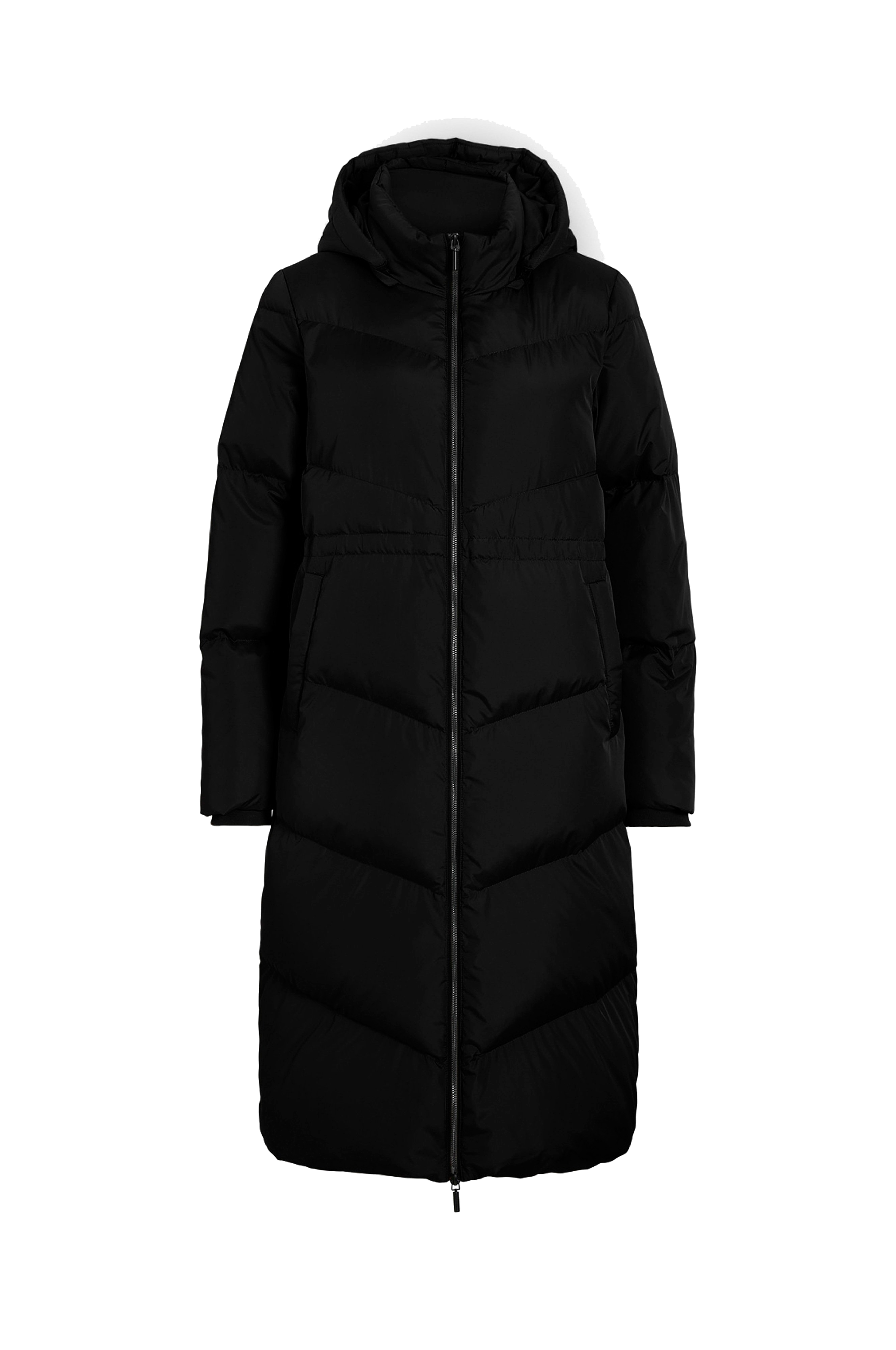 • Lang dunjakke med aftagelig hætte• To-vejs lynlås• To fleeceforede lommer med trykknap• Ribmanchetter ved manchetterne• Indvendig træksnørre ved taljen• Længde: 112 cm i størrelse 36