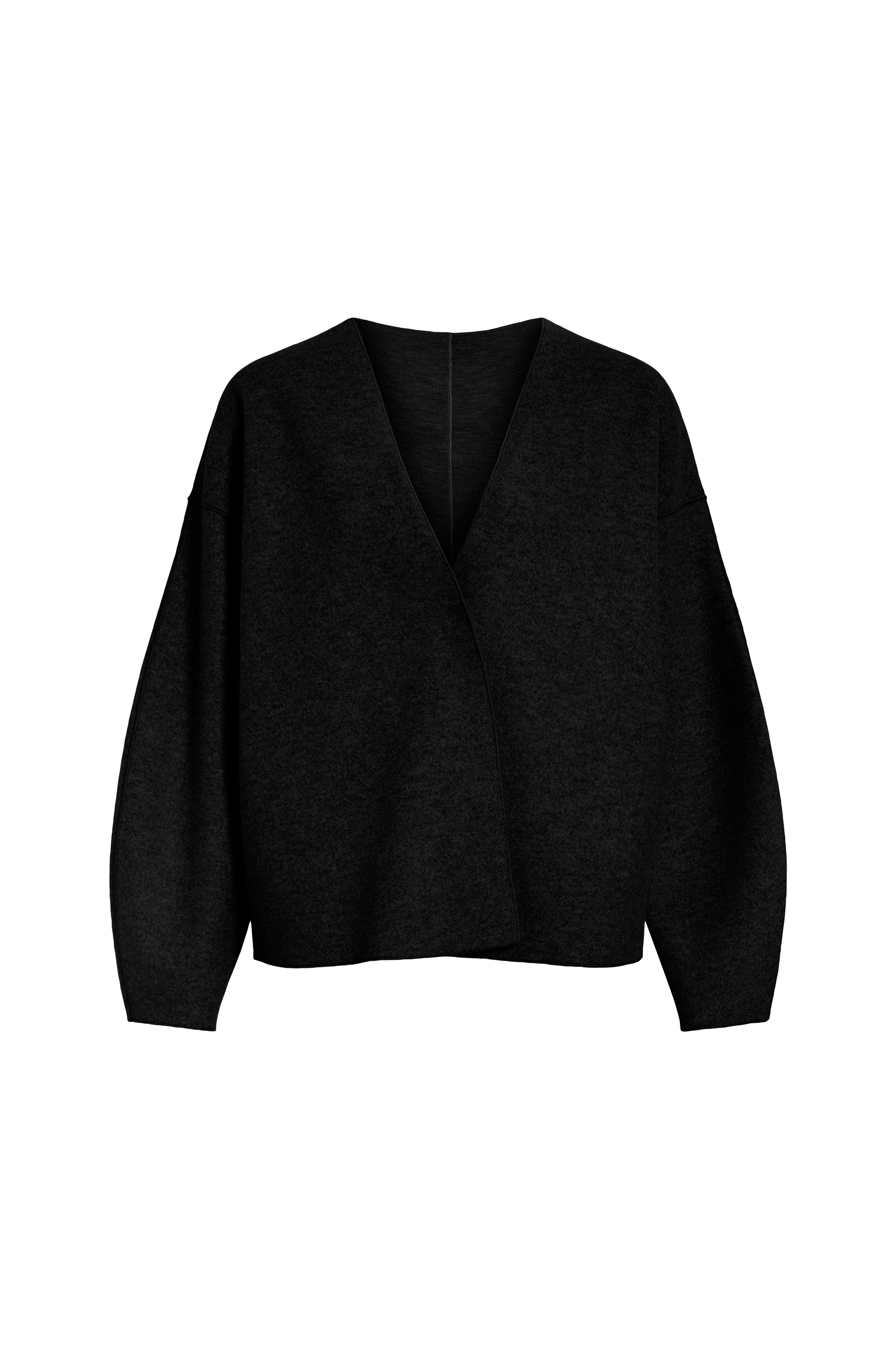 • Bred, lige model med overlockede kanter• V-formet halsudskæring• Skjulte, store trykknapper• Nedsænket skulder med langt ærme• Indlagte sidelommer• Længde: 63 cm i størrelse 36