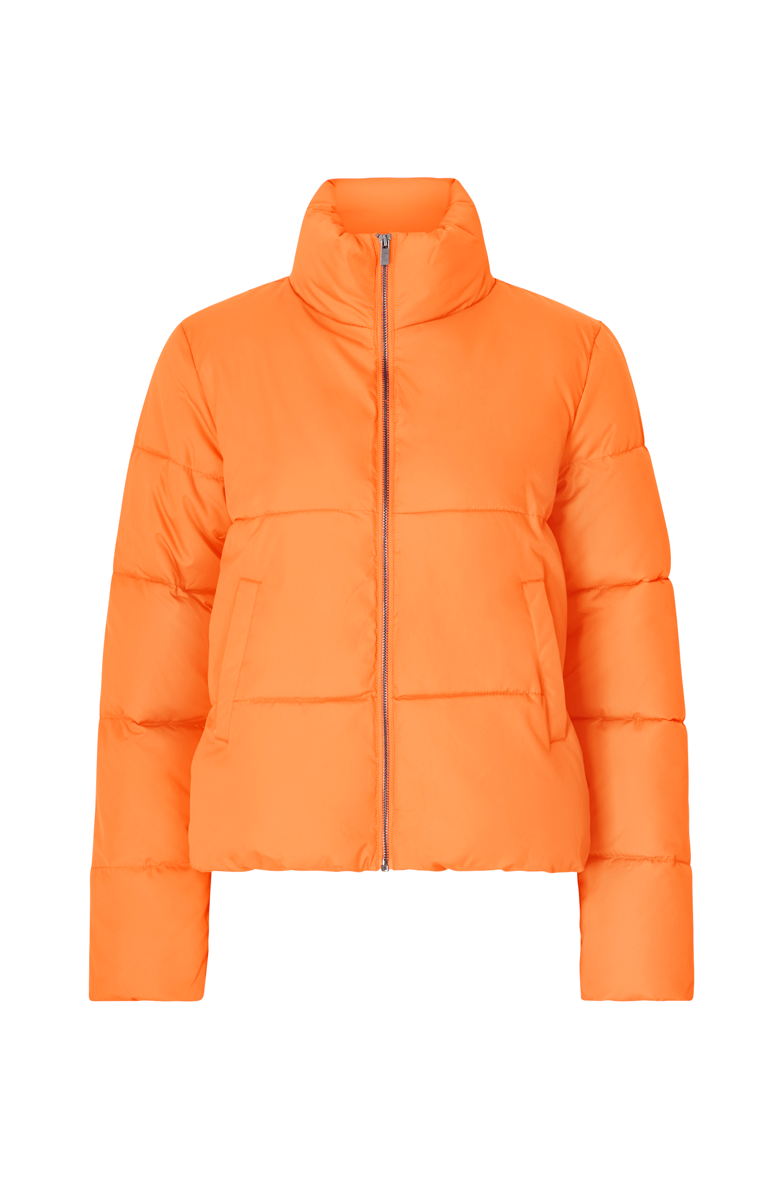 Vatteret jakke i kort model med lynlås foran, to lommer og standkrave. Længde ca. 60 cm i str. 36.