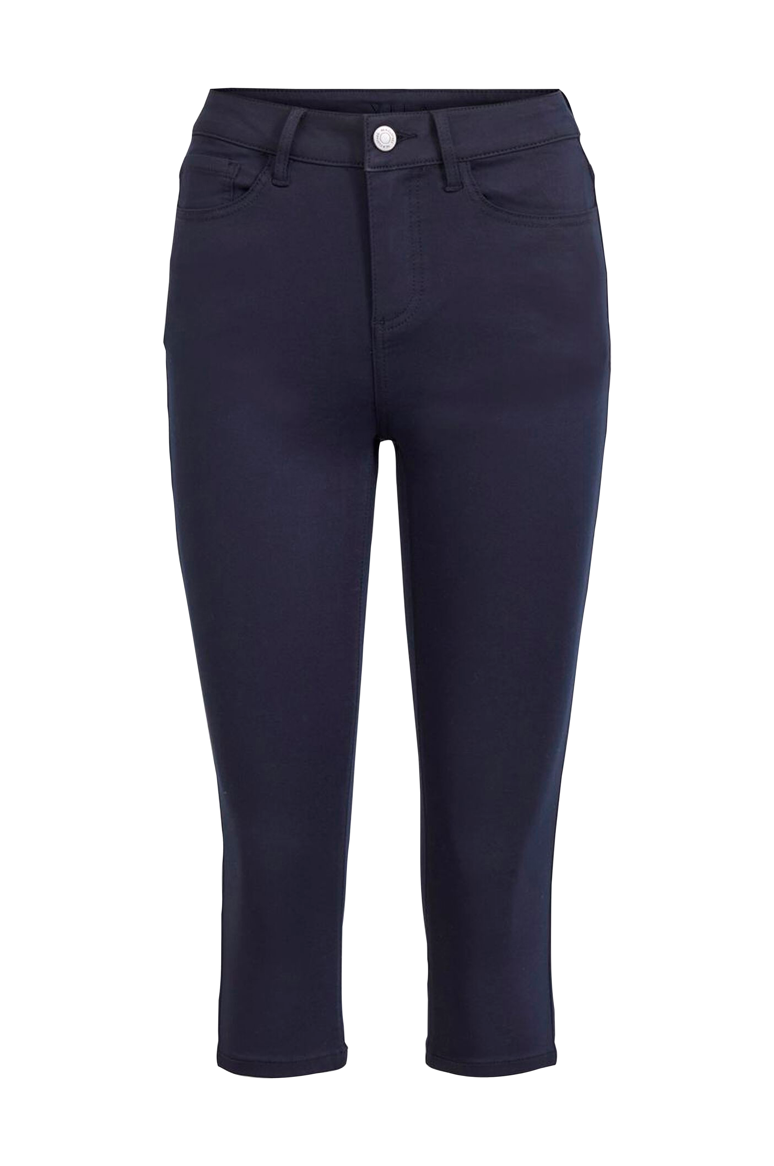 Jeans i smal model med normalhøj talje med lynlås i gylpen. Tre forlommer og to baglommer samt smalle ben og benkant som slutter på læggen. Indvendig benlængde ca. 49 cm i str. S.