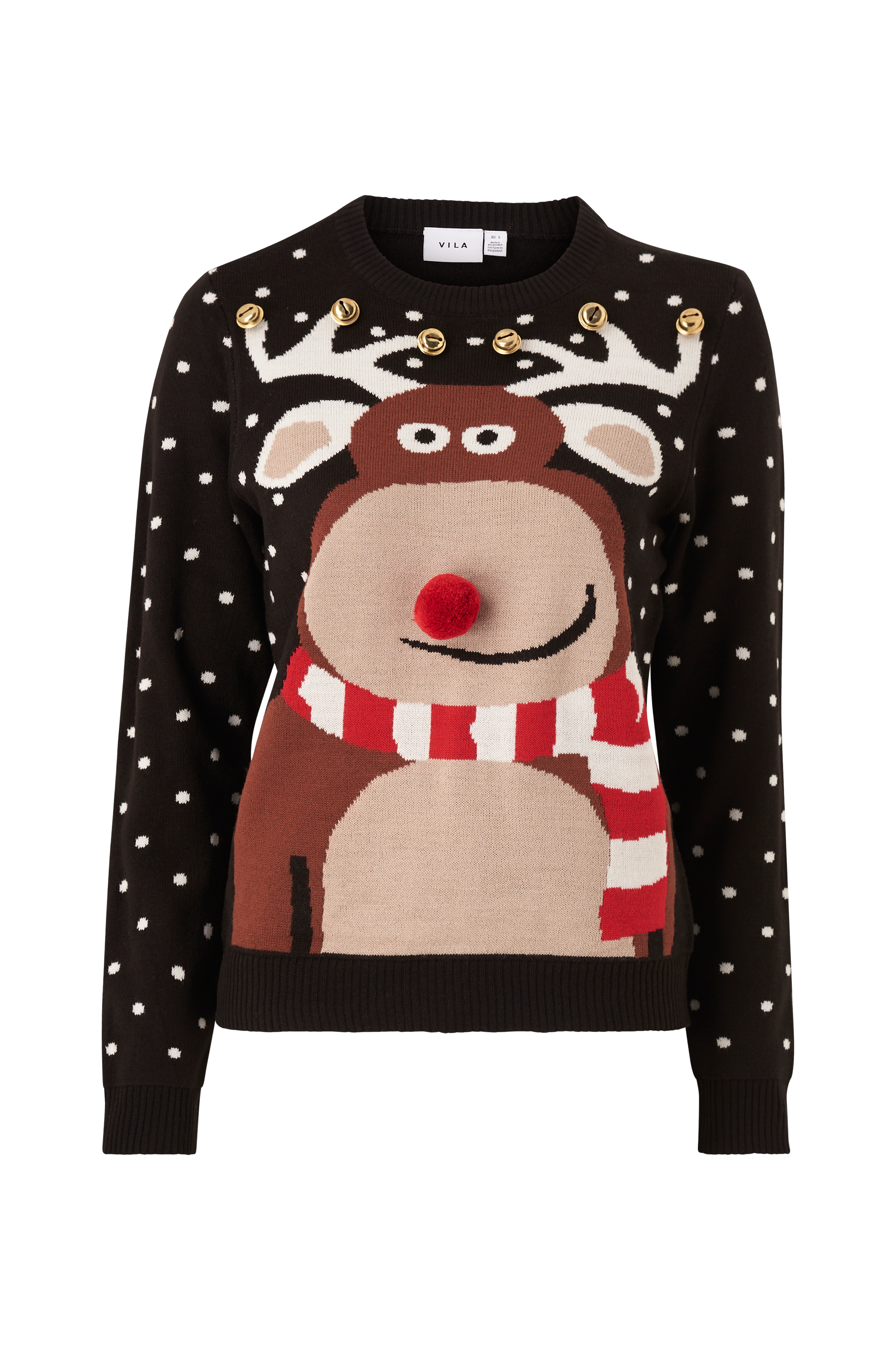 • Model med strikket mønster foran og på ærmerne• Bjælder i metal på brystet• Ribbet rund hals• Langt ærme• Ribstrik ved manchetterne og ved nederste kant