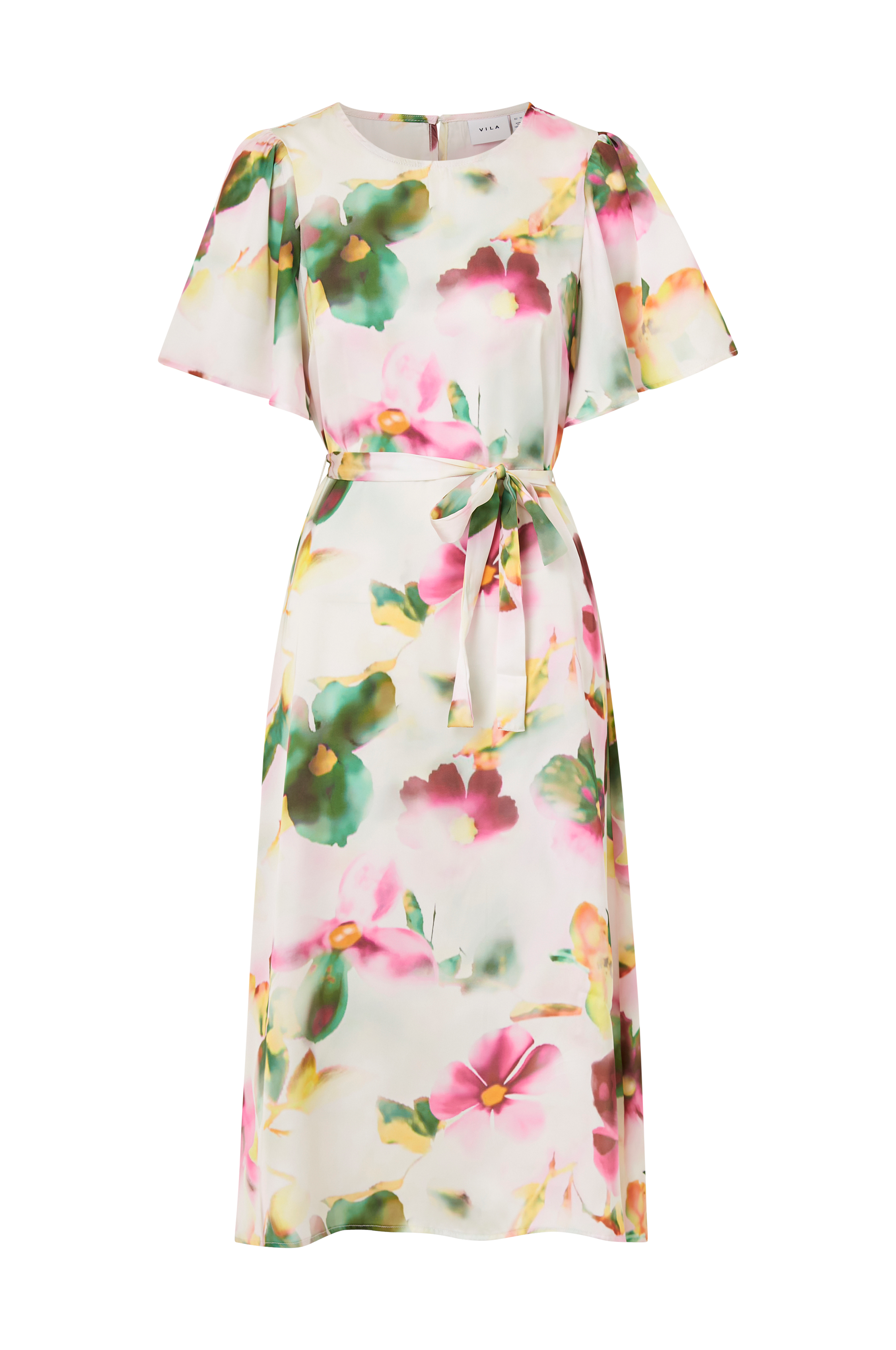 • Blomstret kjole• Kvalitet med glans• Korte sommerfugleærmer• Ventilation med knap i nakken• Bindebælte ved taljen• Længde: 120 cm i størrelse 36