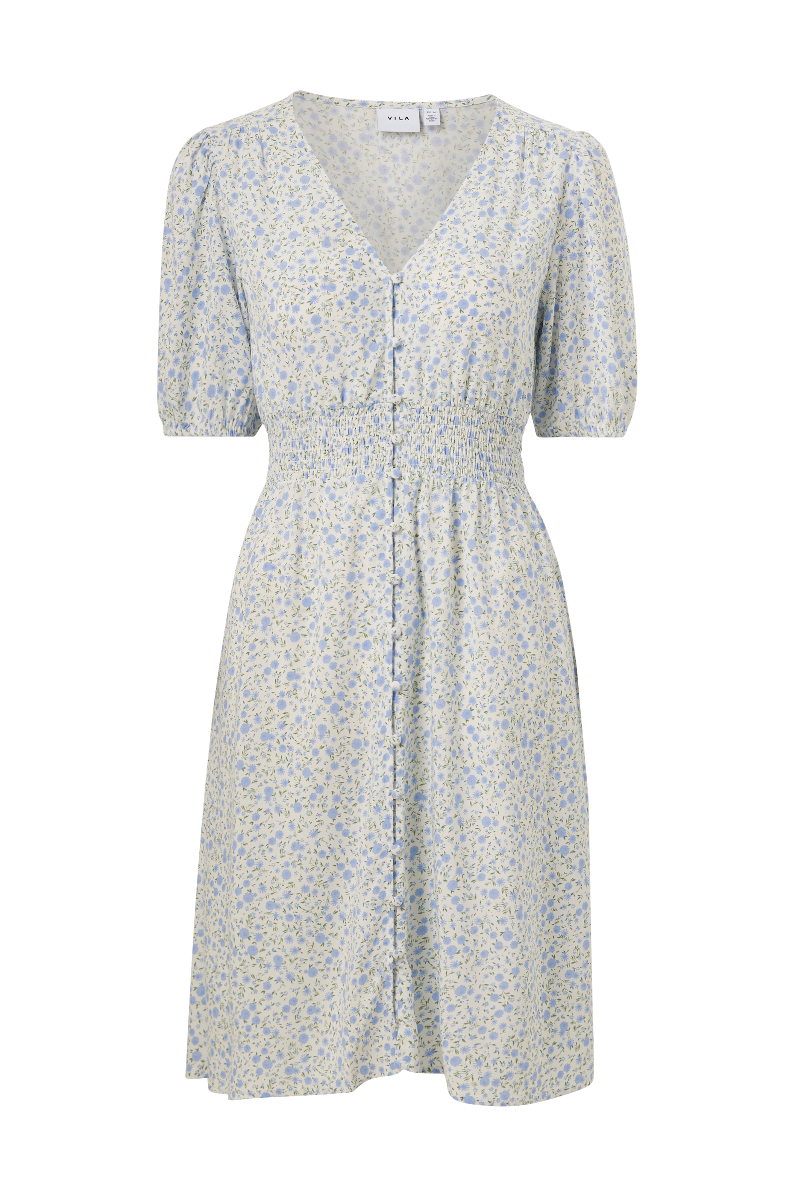 • Kjole i viskose• Gennemknappet model med beklædte knapper• V-formet halsudskæring• Korte ærmer med elastisk bånd ved manchetterne• Smocket parti ved taljen• Længde: 100 cm i størrelse 36