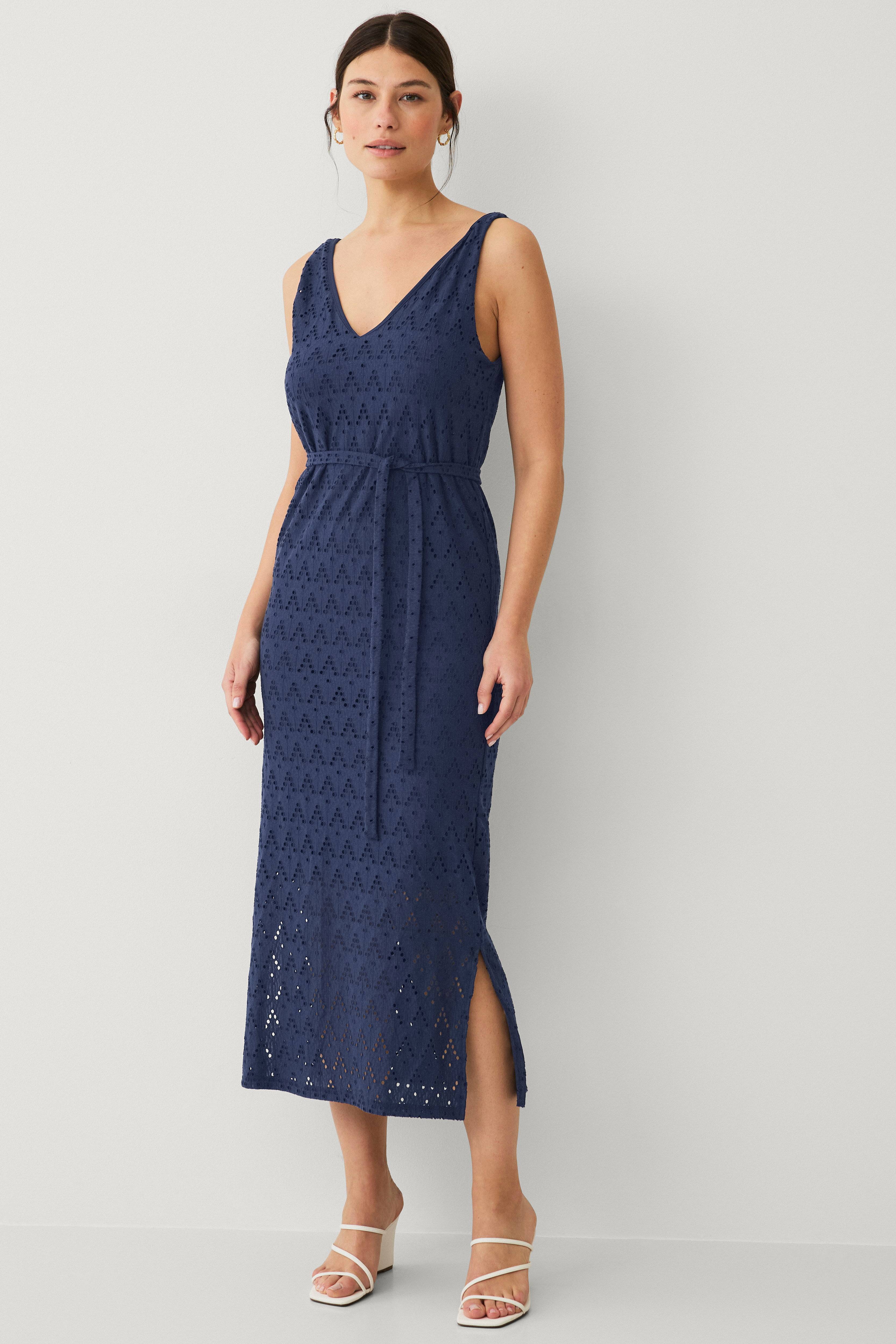 • Ærmeløs model med hulbroderier overalt• V-udskæring i halsen og i nakken• Bindebælte• Slids nede i siderne• Foret• Længde: 125 cm i størrelse S