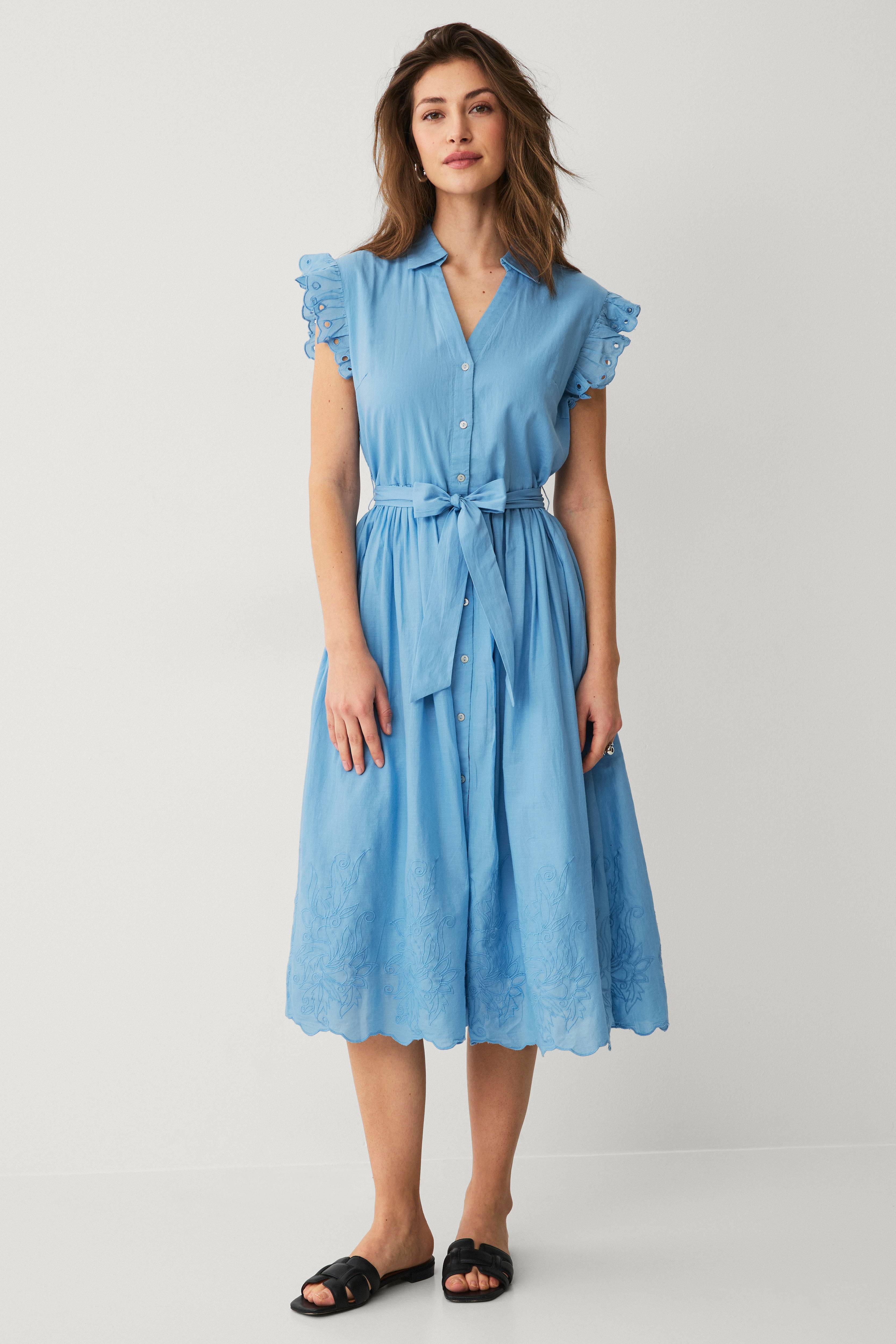 • Bomuldskjole med krave• V-udskæring• Knapper hele vejen frem• Korte flagrende ærmer med hulbroderier• Udskæring ved taljen med samling hele vejen rundt• Broderier på skørtet• Længde: 116 cm i størrelse 36