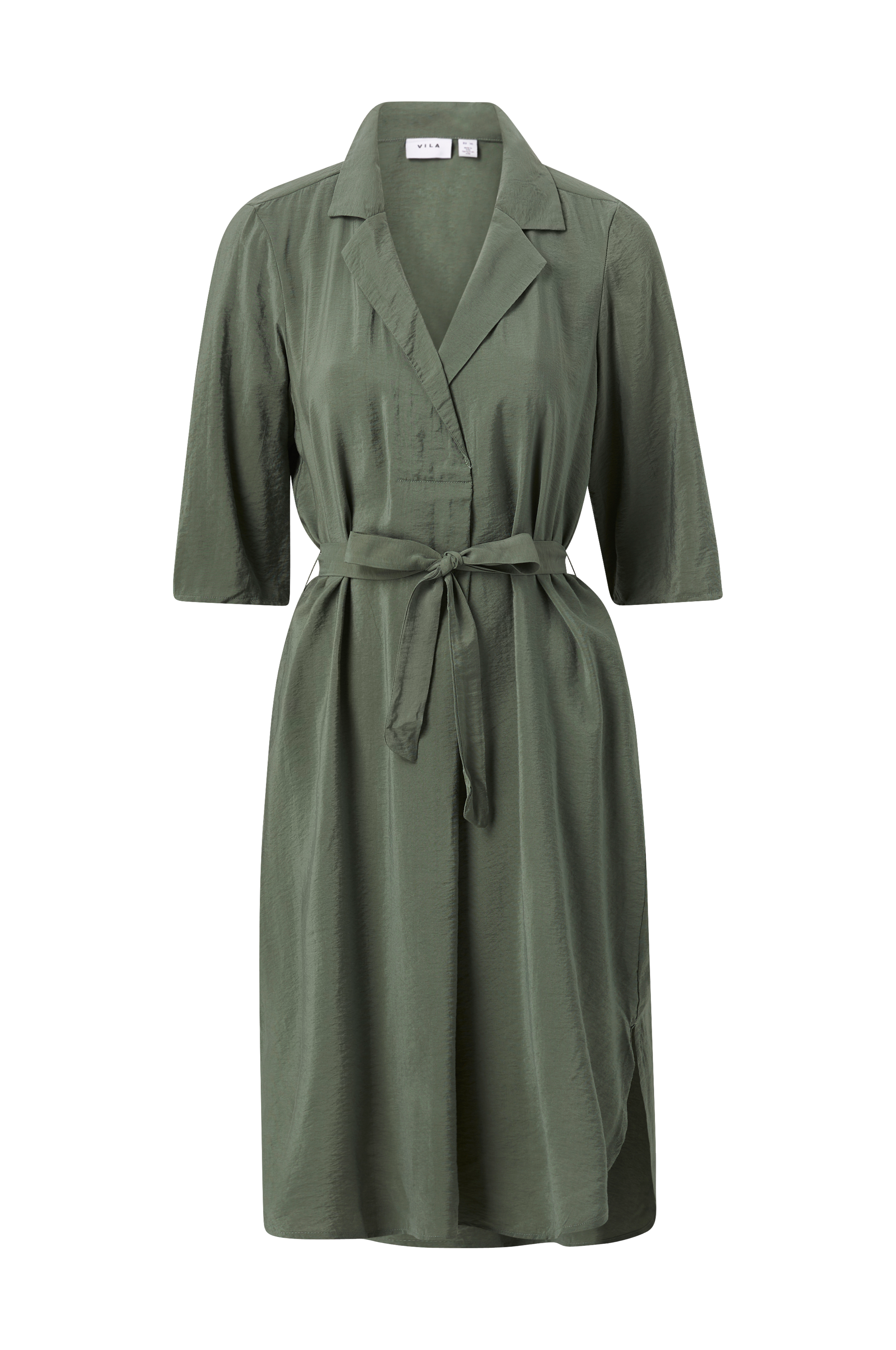 • V-udskæring med krave • 3/4 lange ærmer • Bindebælte ved taljen • Læg foran • Korte slidser i siderne • Længde: 113 cm i størrelse 36 • Produktet indeholder viskose fra Livaeco by Birla Cellulose™, en syntetisk cellulosefiber af træmasse der kommer fra kontrolleret og ansvarsfuldt skovbrug.