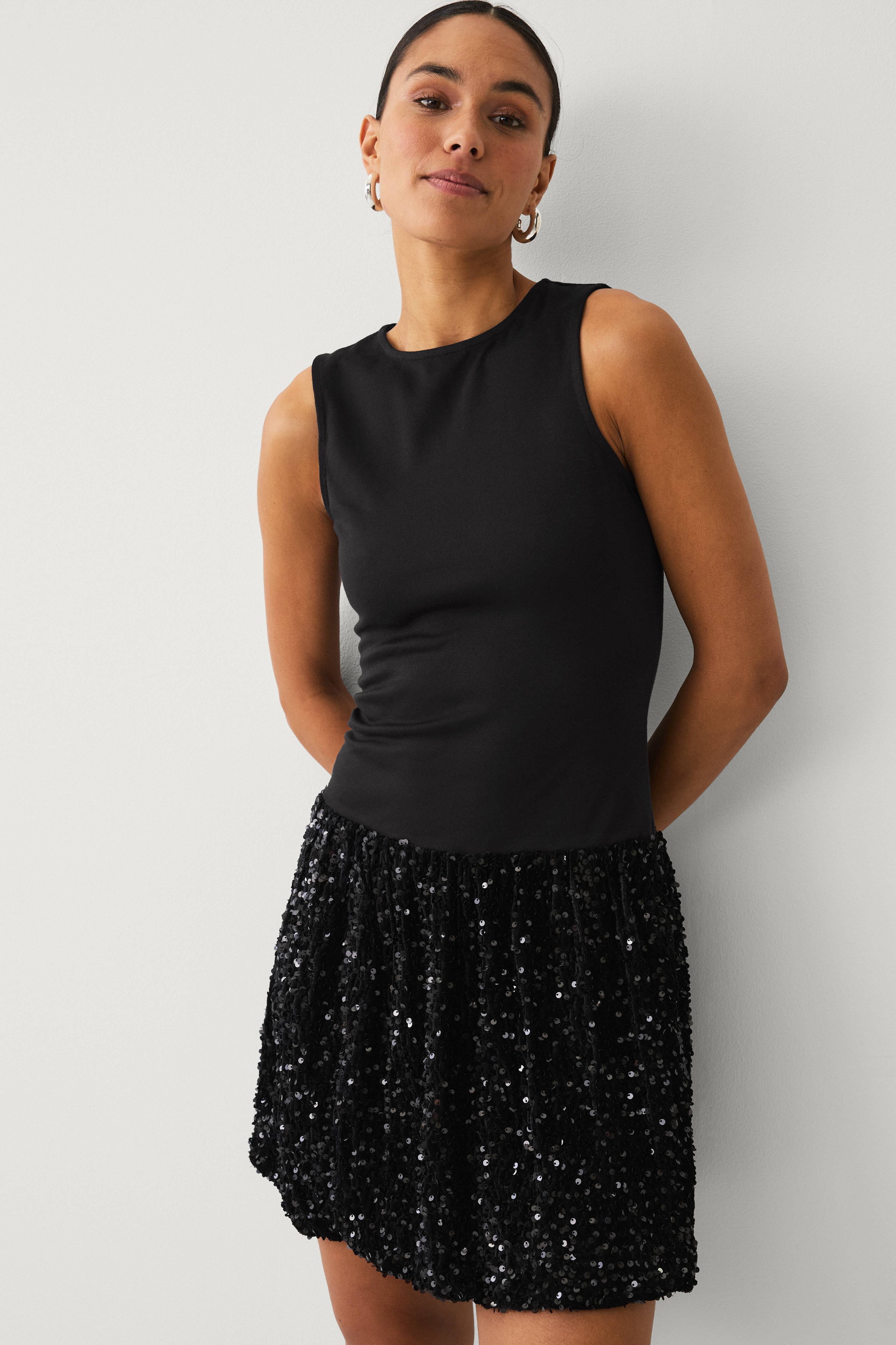 • Ærmeløs, figursyet kjole• Rund halsudskæring med nøglehulsåbning og knap i nakken• Ballonformet nederdel i velour med pailleter hele vejen rundt• Længde: 93 cm i størrelse S