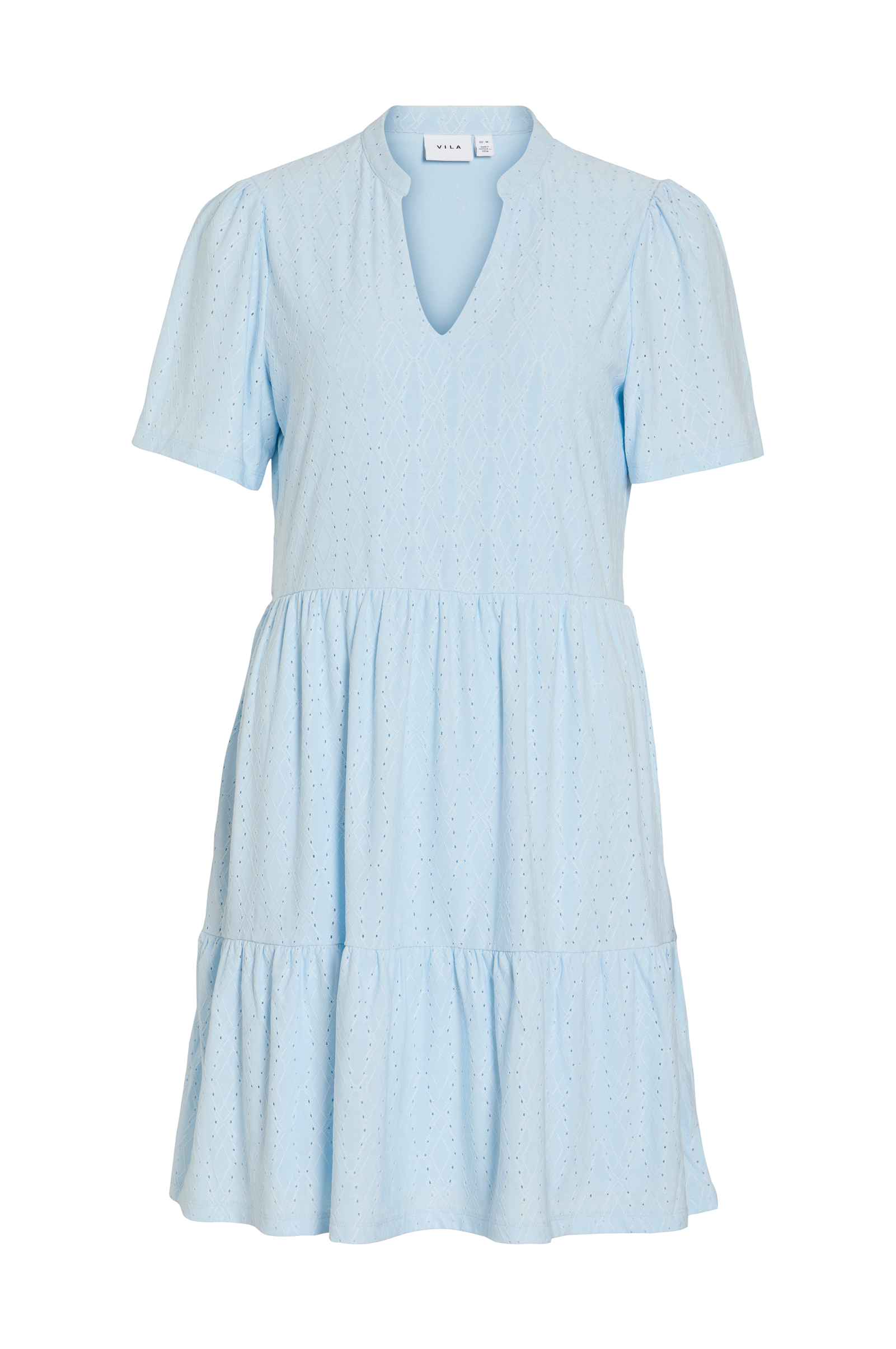 • Blød, foret kjole med hulmønstret design• V-udskæring• Korte pufærmer• Volant nederst• Længde: 95 cm i størrelse S