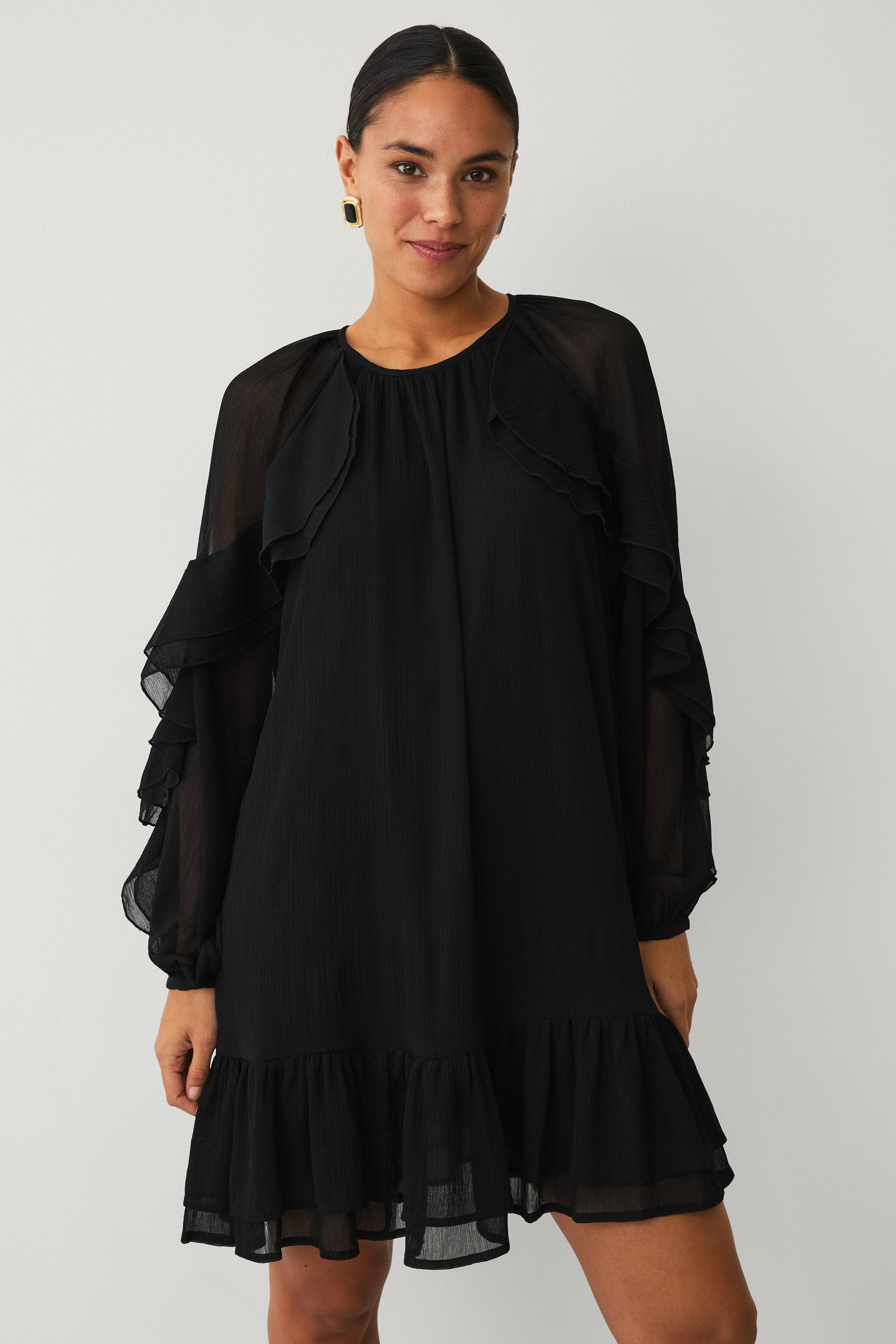 • Foret kjole i rynket materiale • Løs pasform • Rund halsudskæring med nøglehulsåbning og knap i nakken • Lange, uforede ærmer med slids og knap ved manchetterne • Volant foran og langs ærmerne • Volant ved nederste kant • Længde: 95 cm i størrelse 36