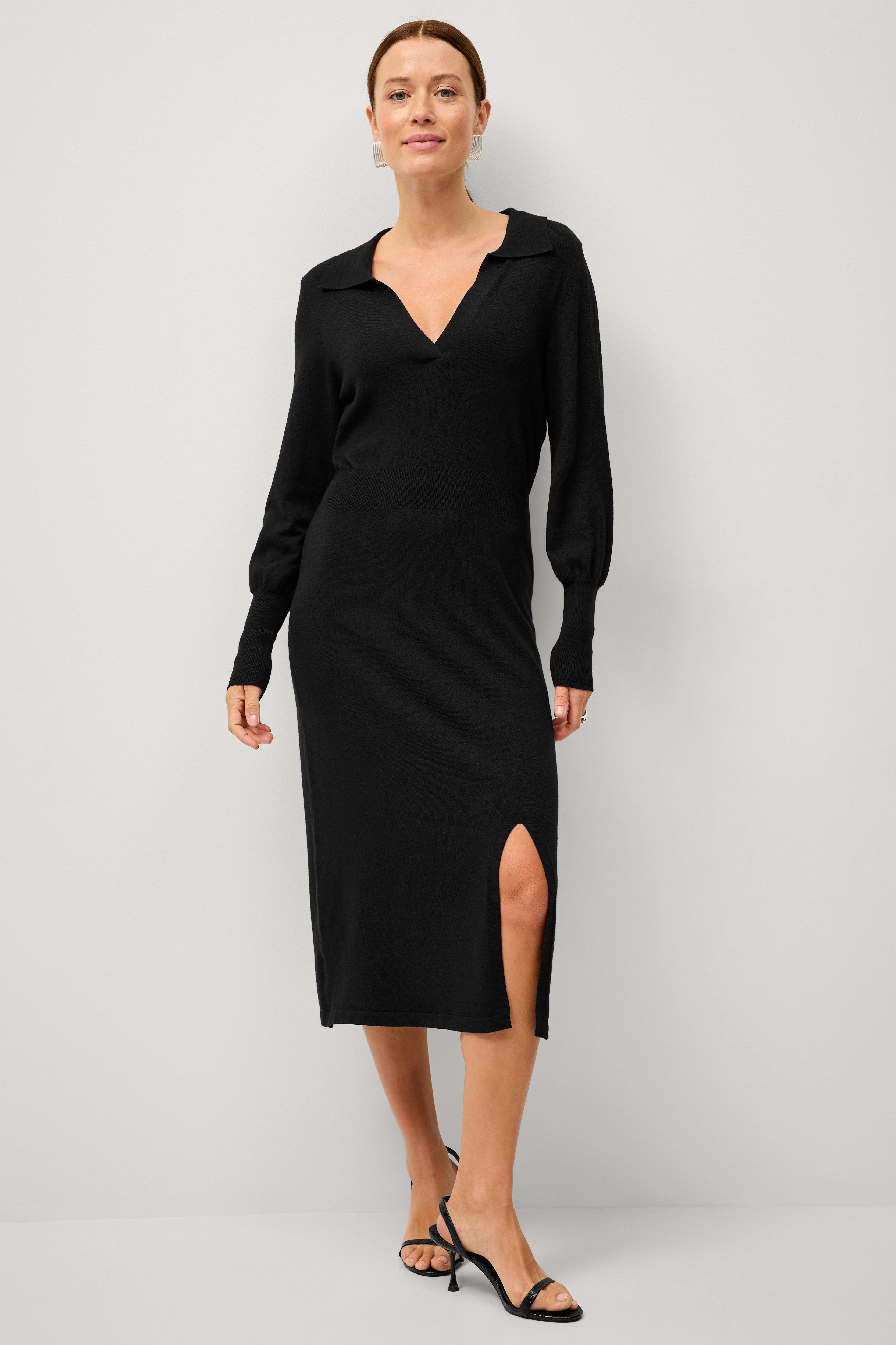 • Figurformede model med ribstrik ved taljen• Ribstrikket krave med v-udskæring foran• Langt ærme med bred ribmanchet• Slids nede foran• Længde: 116 cm i størrelse S
