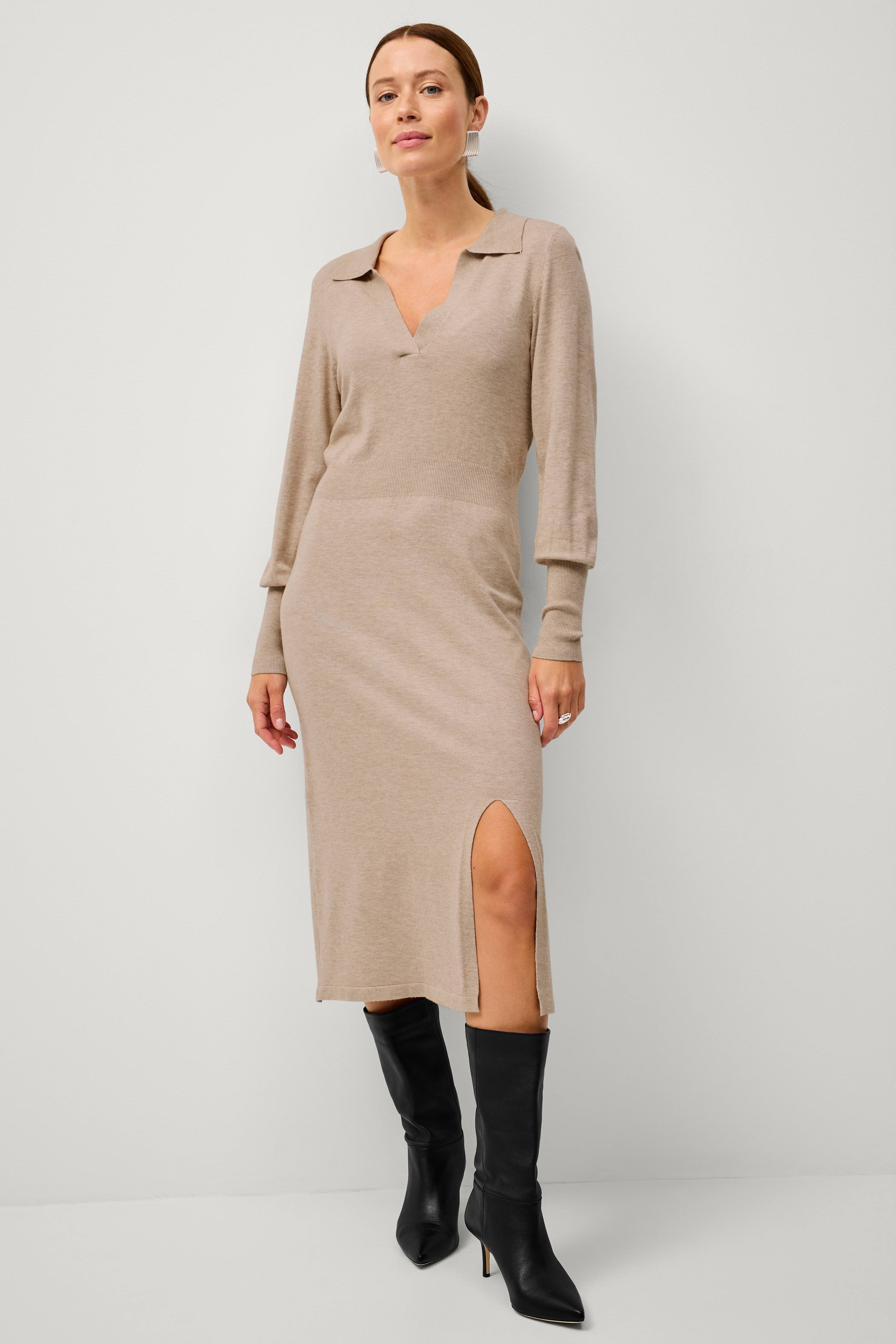 • Figurformede model med ribstrik ved taljen• Ribstrikket krave med v-udskæring foran• Langt ærme med bred ribmanchet• Slids nede foran• Længde: 116 cm i størrelse S