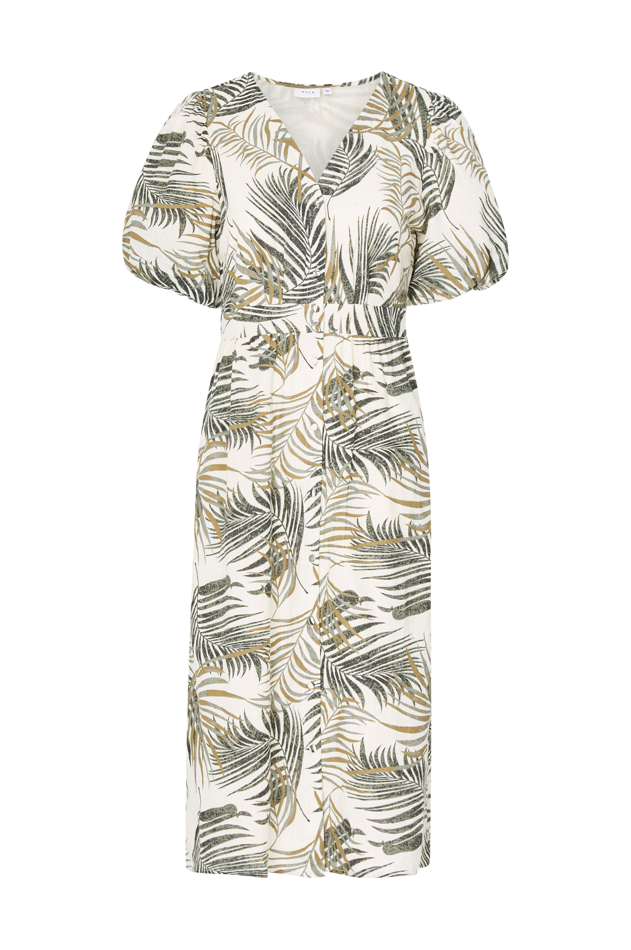• Figursyet, læglængde model• V-udskæring• Stofbetrukkede knapper foran• Korte ballonærmer• Elastisk bånd bagpå ved taljen• Tyndt for• Længde: 113 cm i størrelse 36