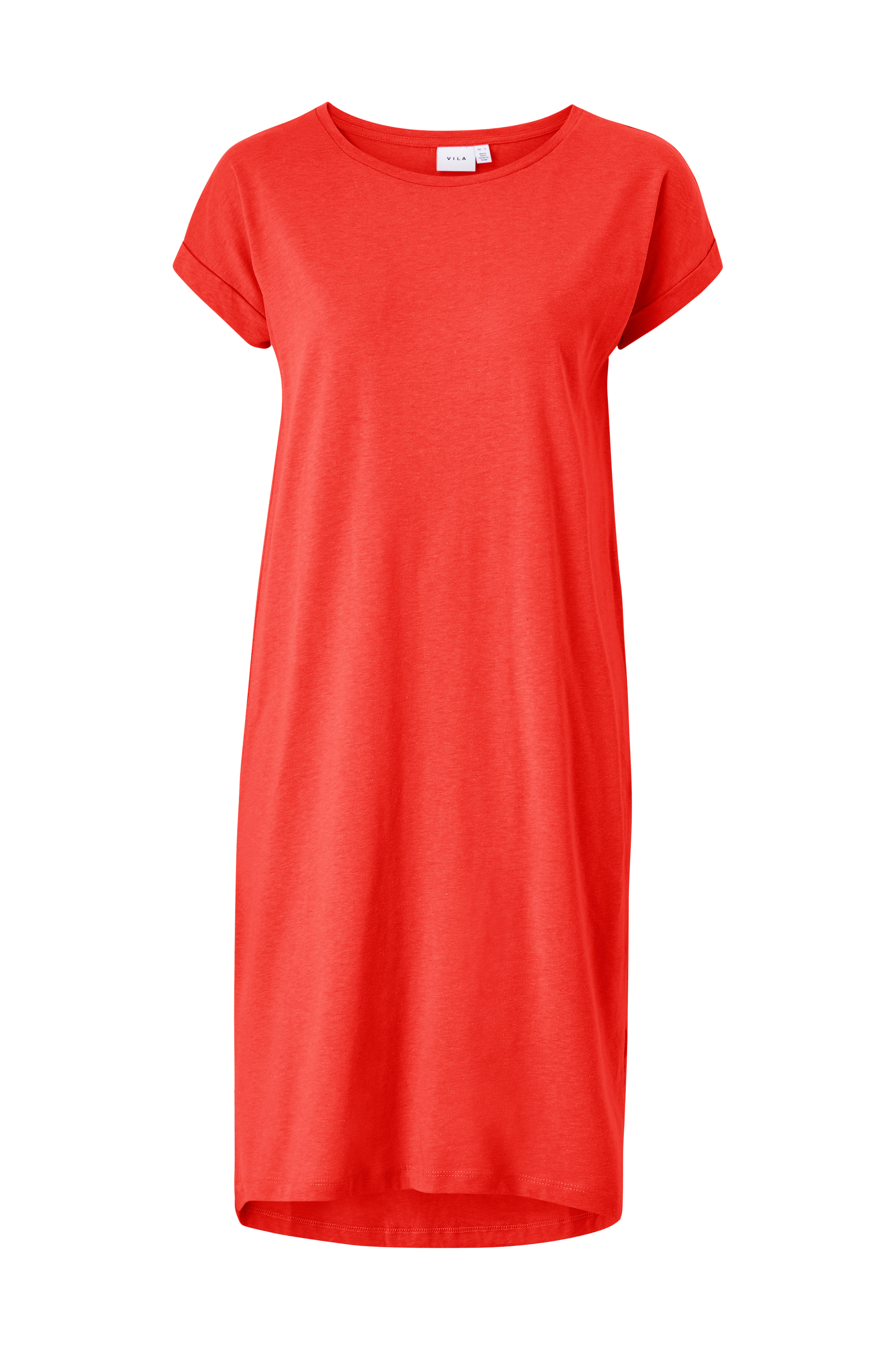 T-shirtkjole i lige model med korte ærmer med opslag og rund hals med rib. Kjolen er noget længere bagpå. Længde foran ca. 98 cm i str. S.