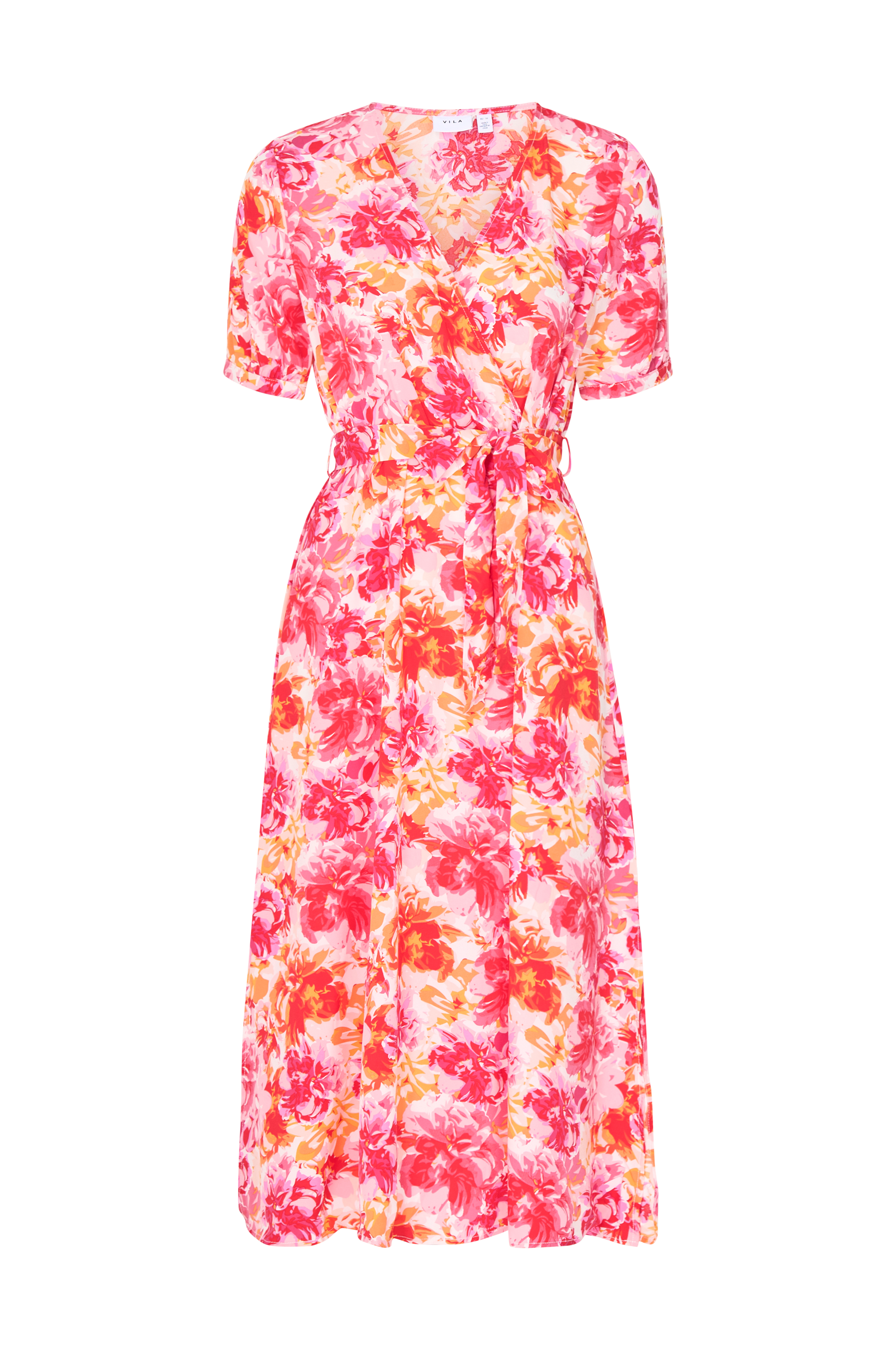 • Midikjole• V-udskæring med slå-om• Elastisk talje med bindebælte• Korte ærmer• Længde: 121 cm i størrelse 36