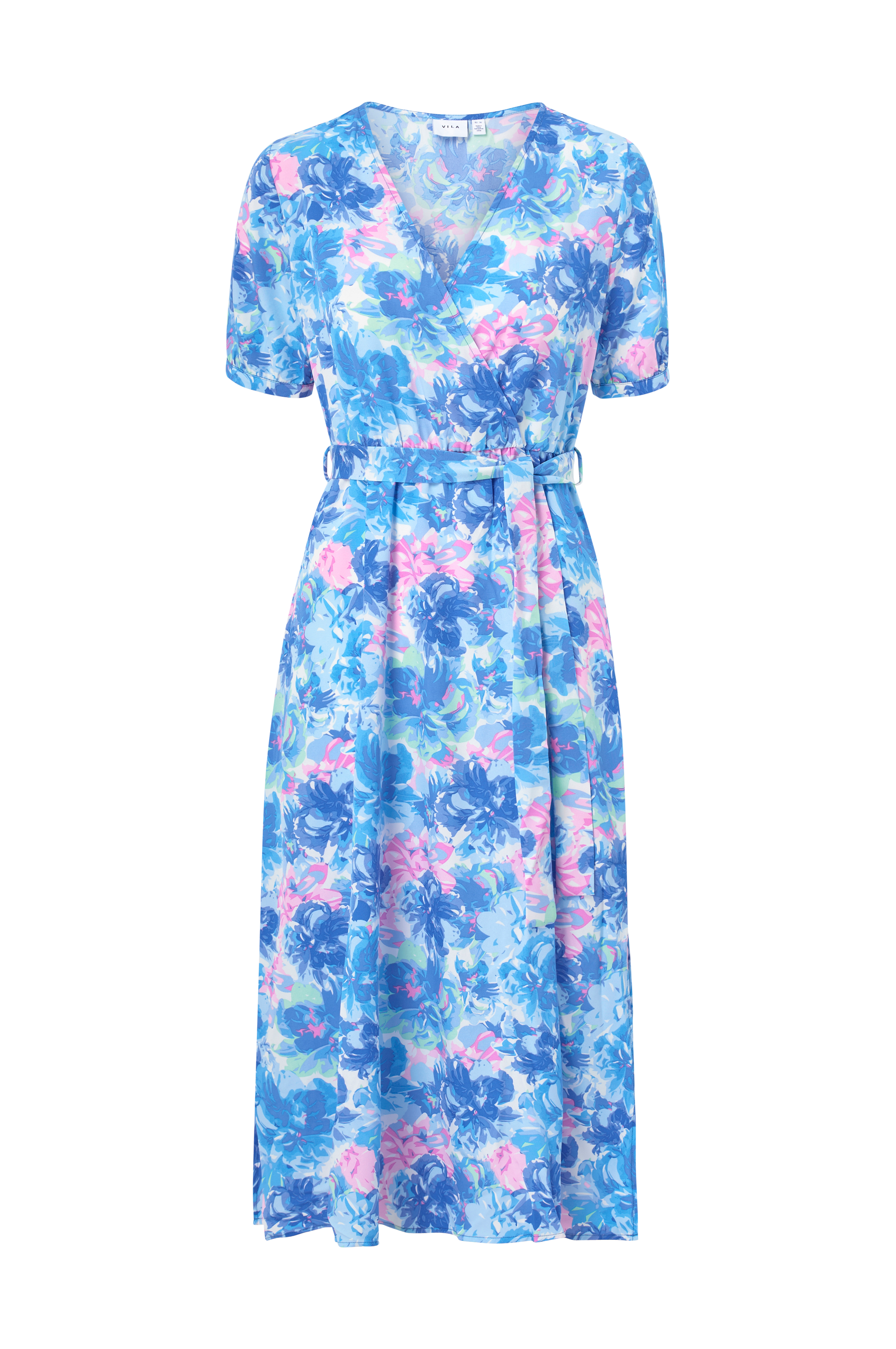 • Midikjole• V-udskæring med slå-om• Elastisk talje med bindebælte• Korte ærmer• Længde: 121 cm i størrelse 36