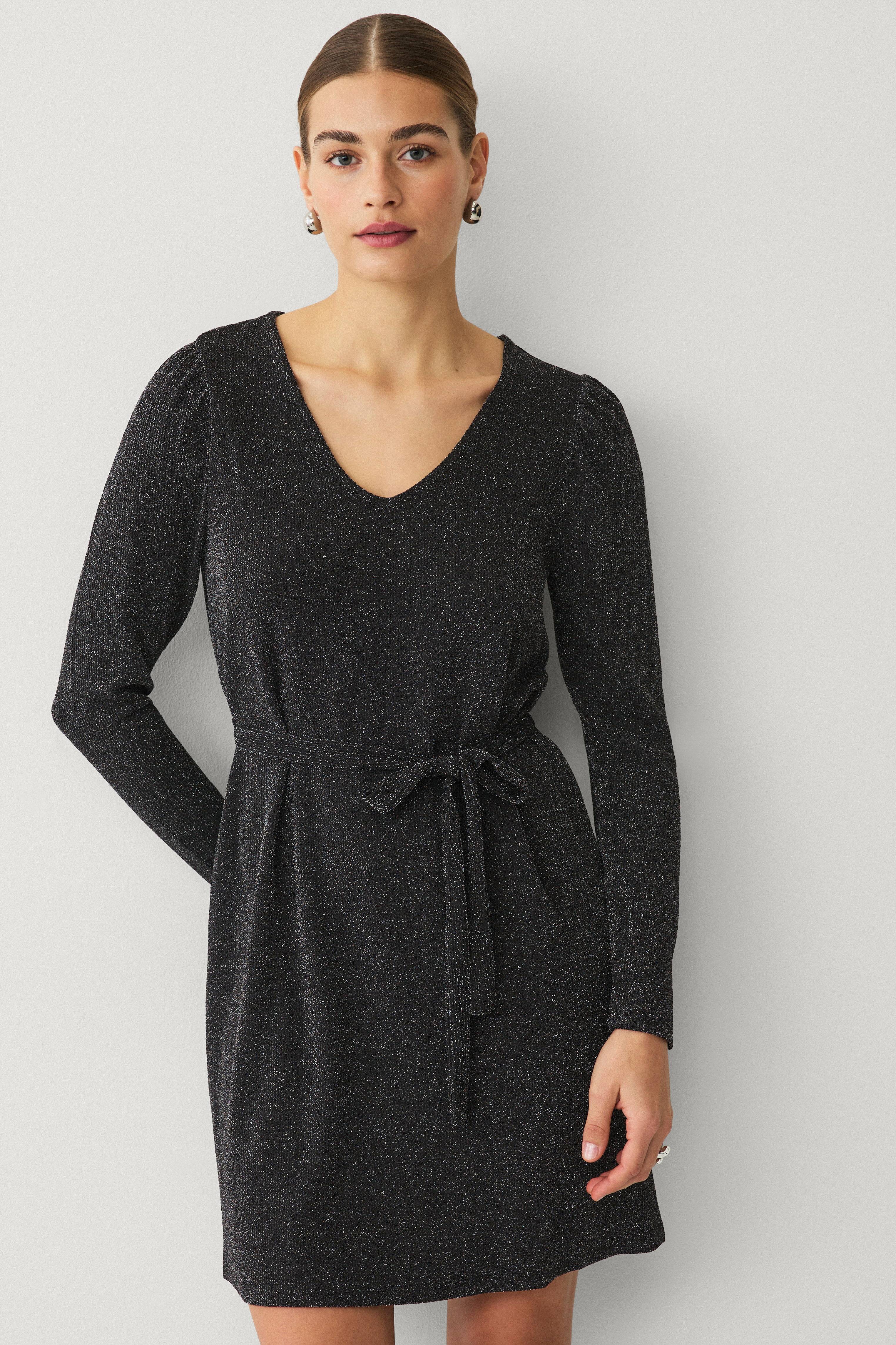 • Midikjole i glitrende, blødt, elastisk materiale• Lange ballonærmer• V-formet halsudskæring• Dekorativt bindebånd ved taljen• Længde: 88 cm i størrelse S