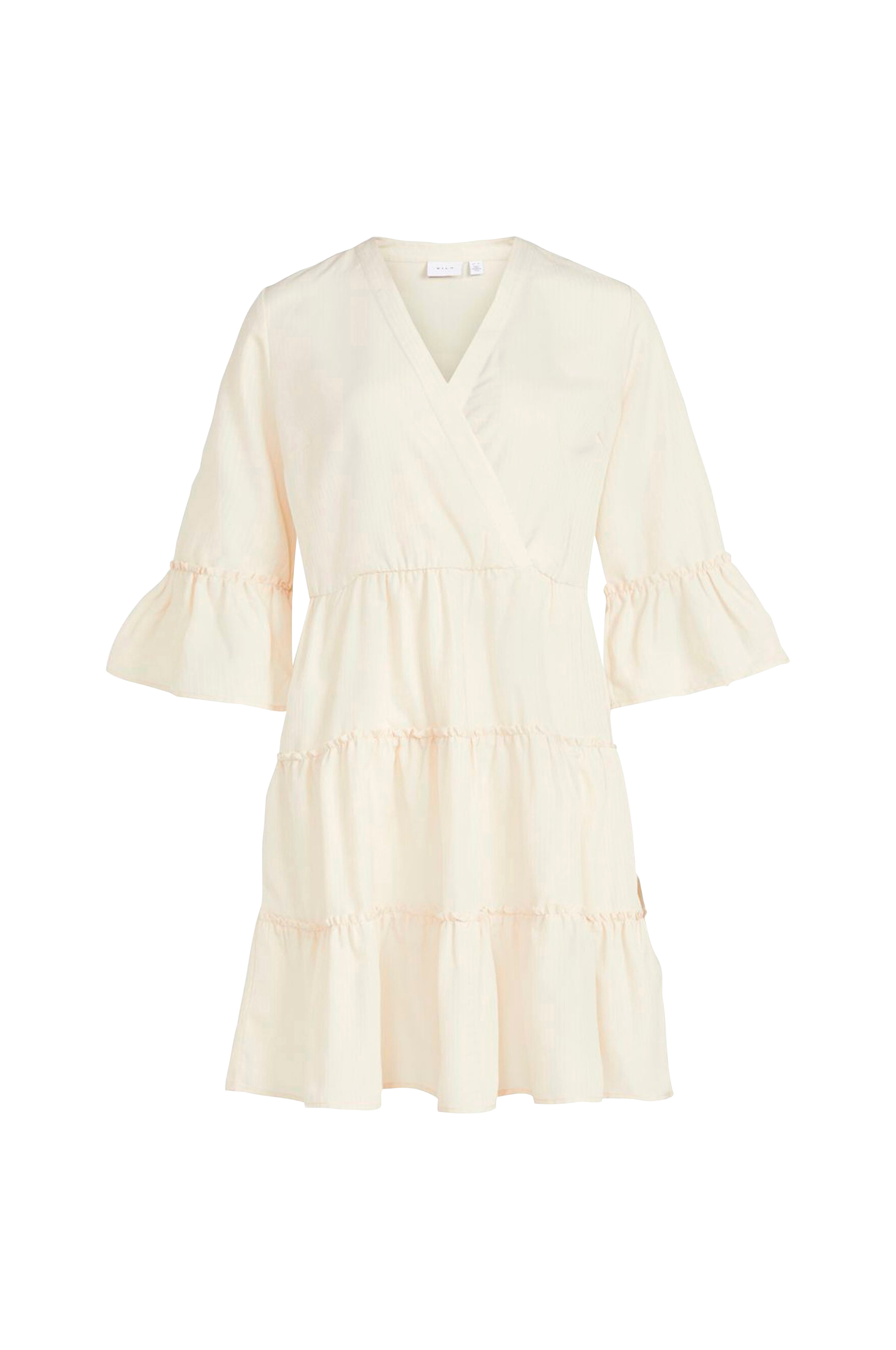 - V-udskæring med slå-om - 3/4-lange ærmer med flæse - Rynket talje - A-formet nederdel med smalle flæser - Længde: 92 cm i str. 36 - Produktet indeholder genindvundet materiale, som genbruges for at reducere mængden af affald samtidigt med at der ikke anvendes nye ressourcer.