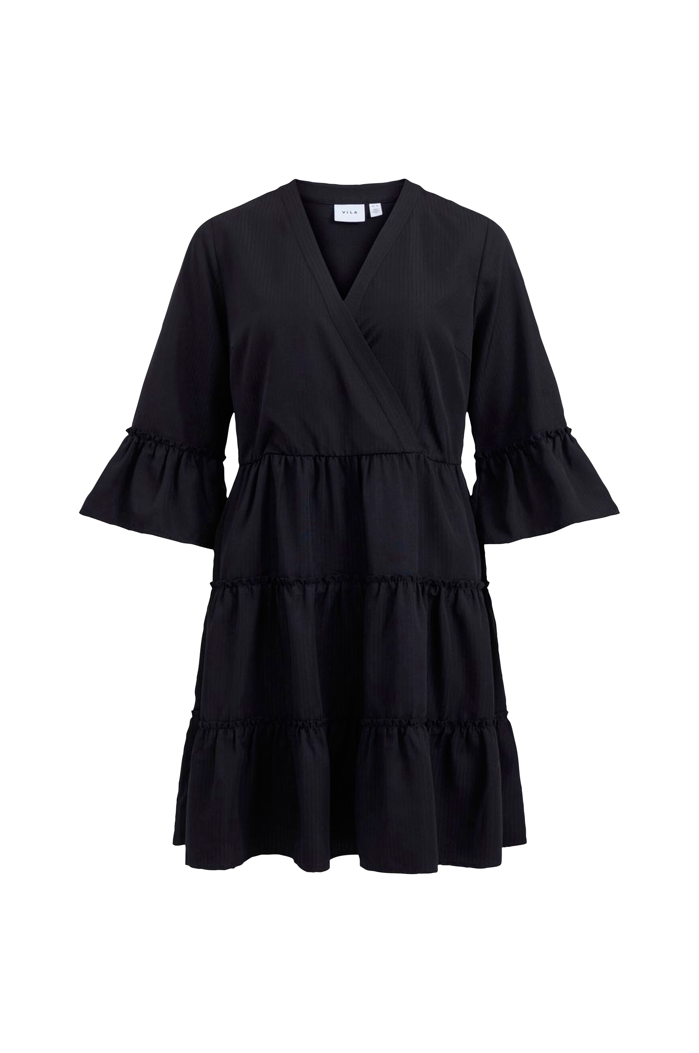 - V-udskæring med slå-om - 3/4-lange ærmer med flæse - Rynket talje - A-formet nederdel med smalle flæser - Længde: 92 cm i str. 36 - Produktet indeholder genindvundet materiale, som genbruges for at reducere mængden af affald samtidigt med at der ikke anvendes nye ressourcer.