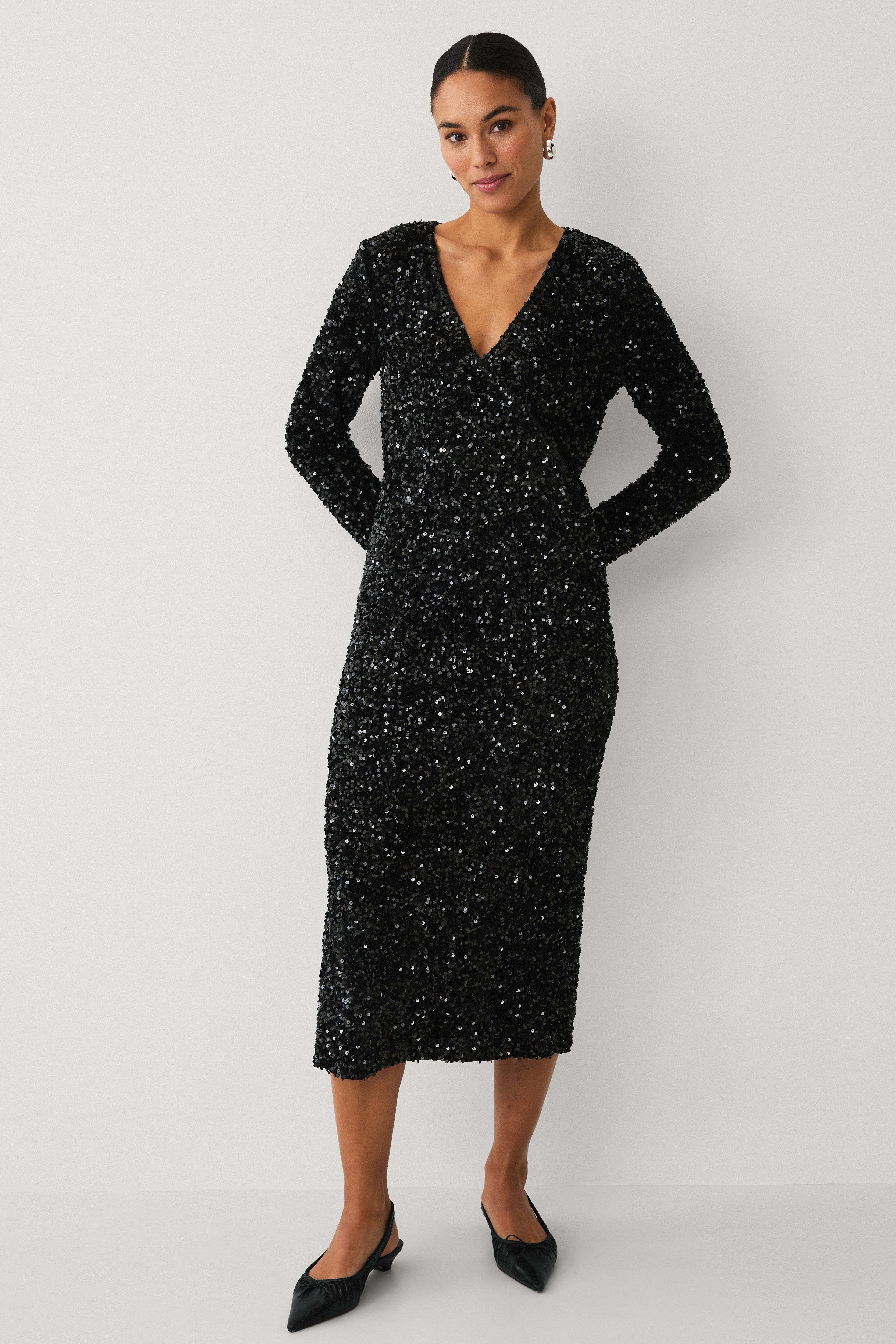 • Foret midikjole i velour med pailleter hele vejen rundt• V-formet halsudskæring med slå-om detalje• Lange ærmer• Elastisk udskæring ved taljen• Slids nede bagved• Længde: 126 cm i størrelse S