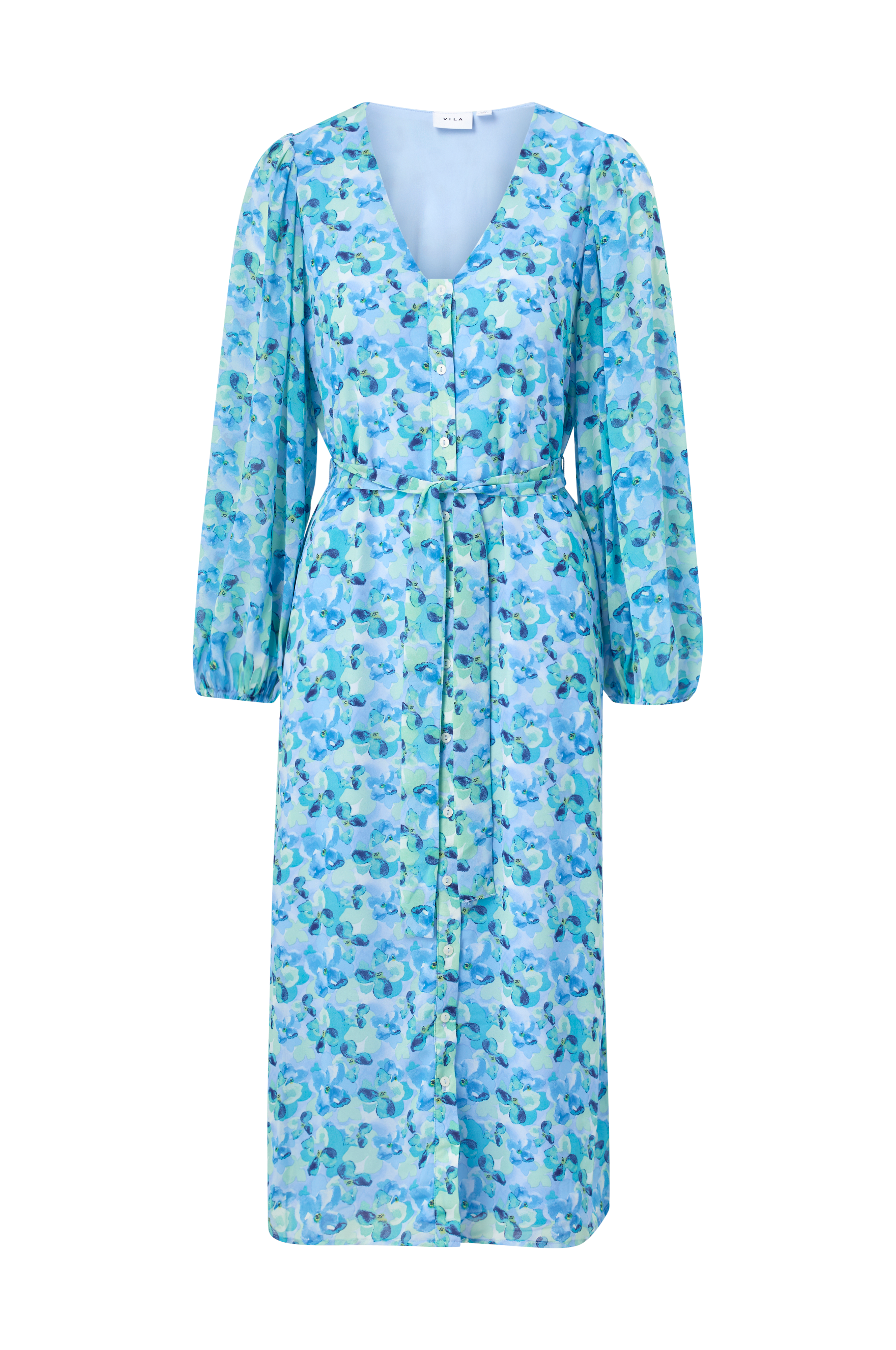 • Foret kjole med printet mønster • V-formet halsudskæring • Gennemknappet model • Uforede ballonærmer med elastisk bånd ved manchetterne • Aftageligt bæltespænde ved taljen • Længde: 123 cm i størrelse 36 • Produktet indeholder genindvundet materiale, som genbruges for at reducere mængden af affald samtidigt med at der ikke anvendes nye ressourcer.
