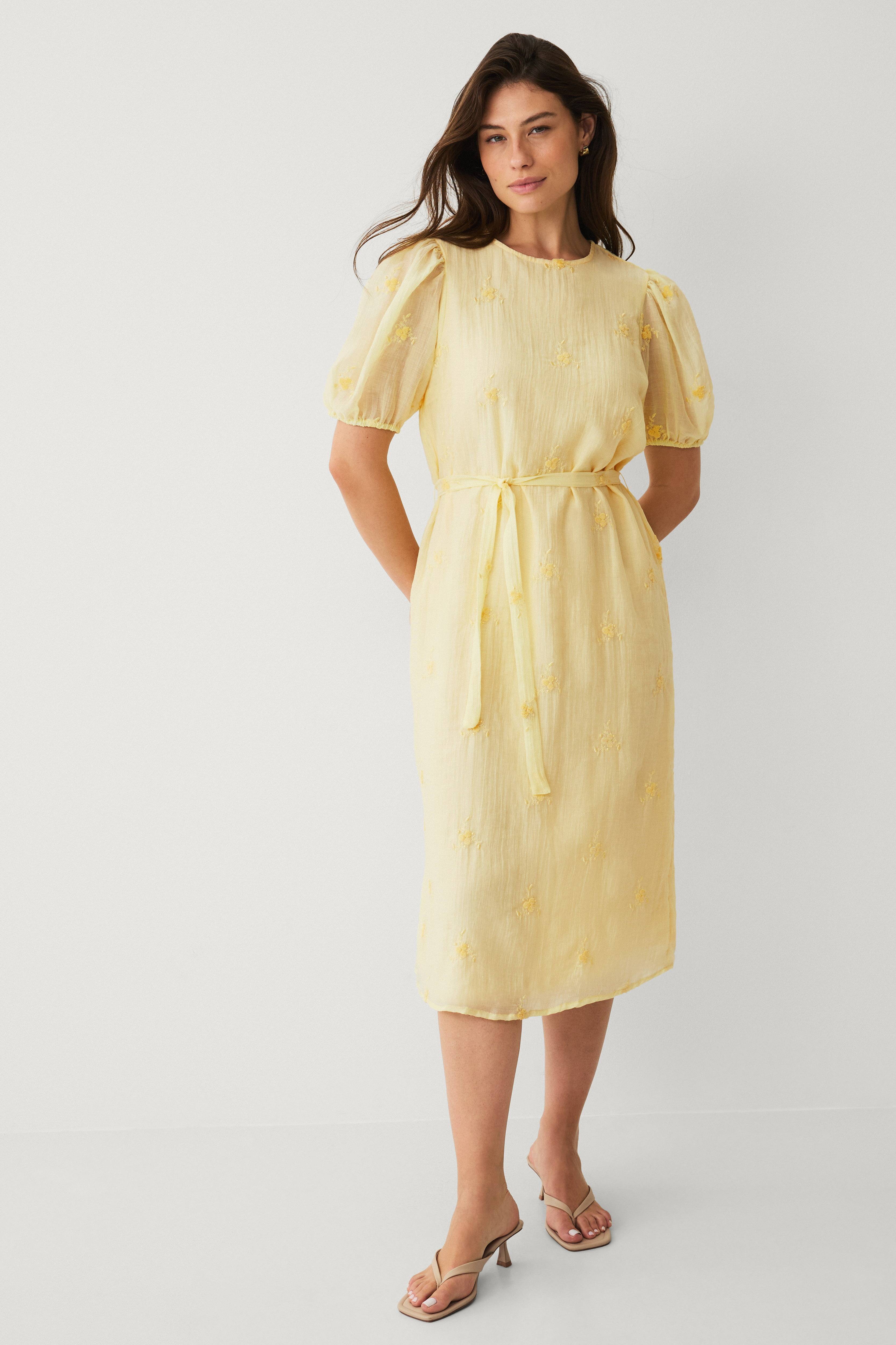 • Foret midikjole med blomstrede, broderede applikationer hele vejen rundt • Rund halsudskæring med nøglehulsåbning og knap i nakken • Korte pufærmer med elastik ved manchetterne • Aftageligt bindebælte ved taljen • Længde: 119 cm i størrelse 36