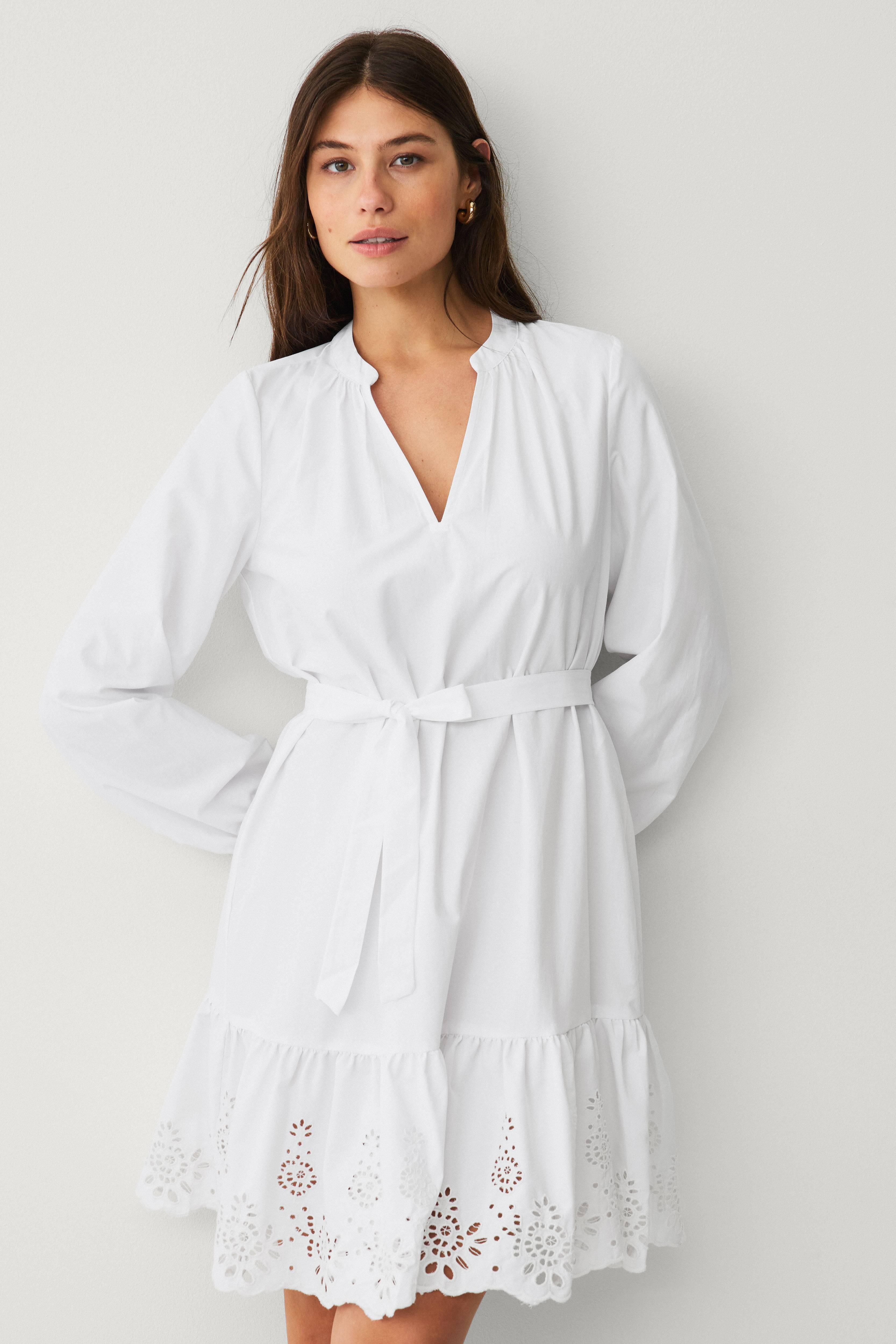 • Kjole med broderet flæsekant nederst• V-udskæring• Lange ærmer• Elastik ved manchetterne• Aftageligt bindebælte ved taljen• Længde: 97 cm i størrelse 36