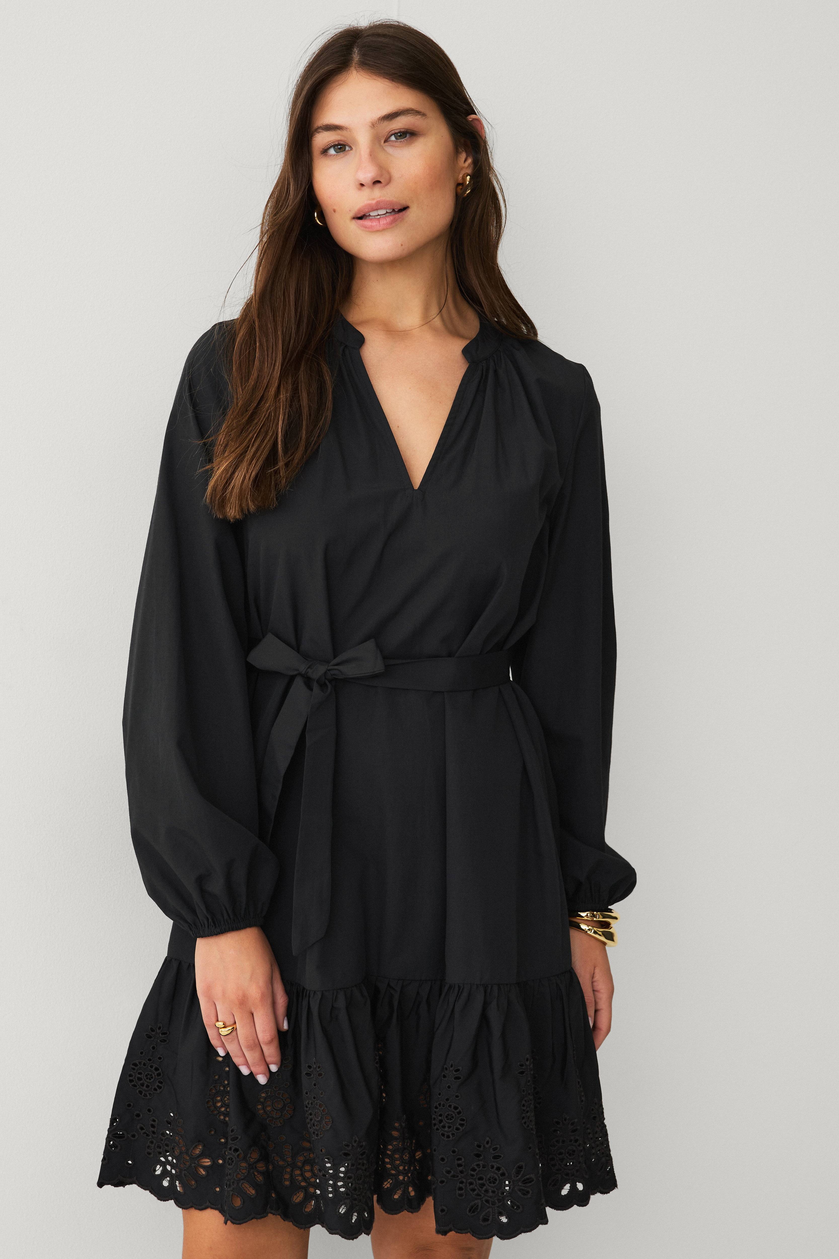 • Kjole med broderet flæsekant nederst• V-udskæring• Lange ærmer• Elastik ved manchetterne• Aftageligt bindebælte ved taljen• Længde: 97 cm i størrelse 36