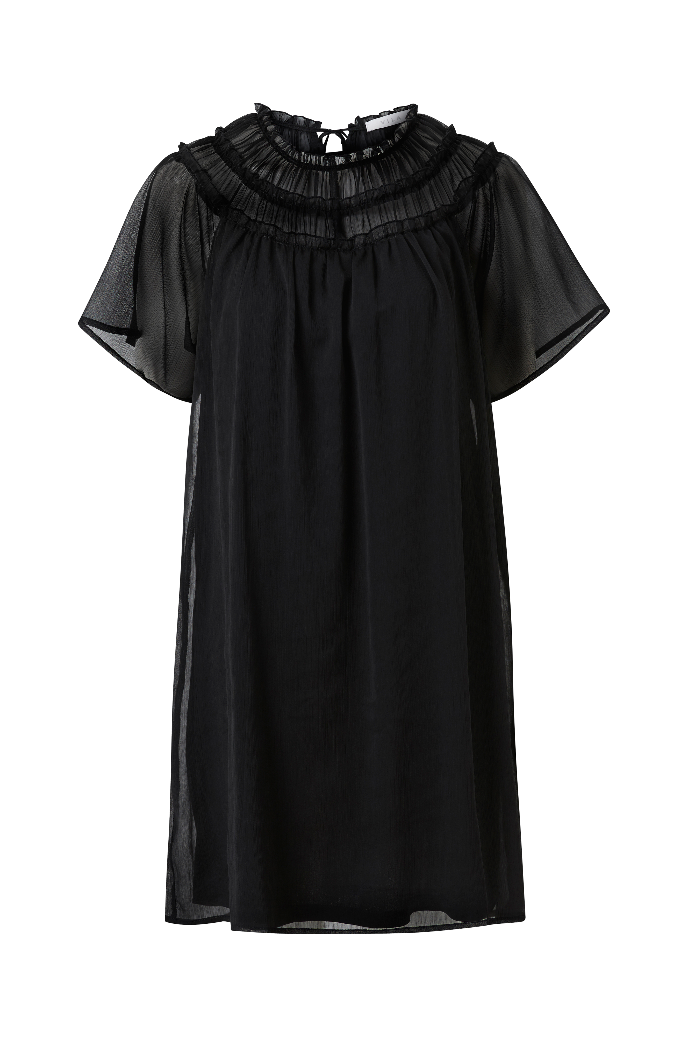 Kjole viLalia S/S Dress fra Vila i tynd chiffon med let crepet struktur. Rund hals med smalle flæser rundt om og slids og bindebånd i nakken. Foret. Længde ca. 92 cm i str. 36.