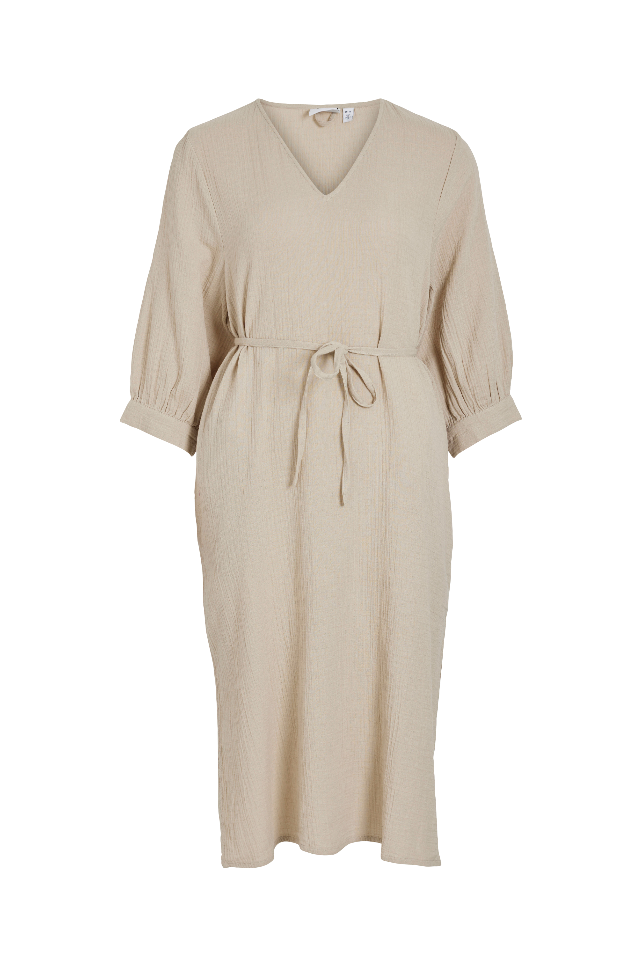• Oversize model med indlagte sidelommer• V-formet halsudskæring• 3/4 langt ærme med manchet ved manchetterne• Tyndt bindebælte ved taljen• Slids nede i siderne• Længde: 114 cm i størrelse 36