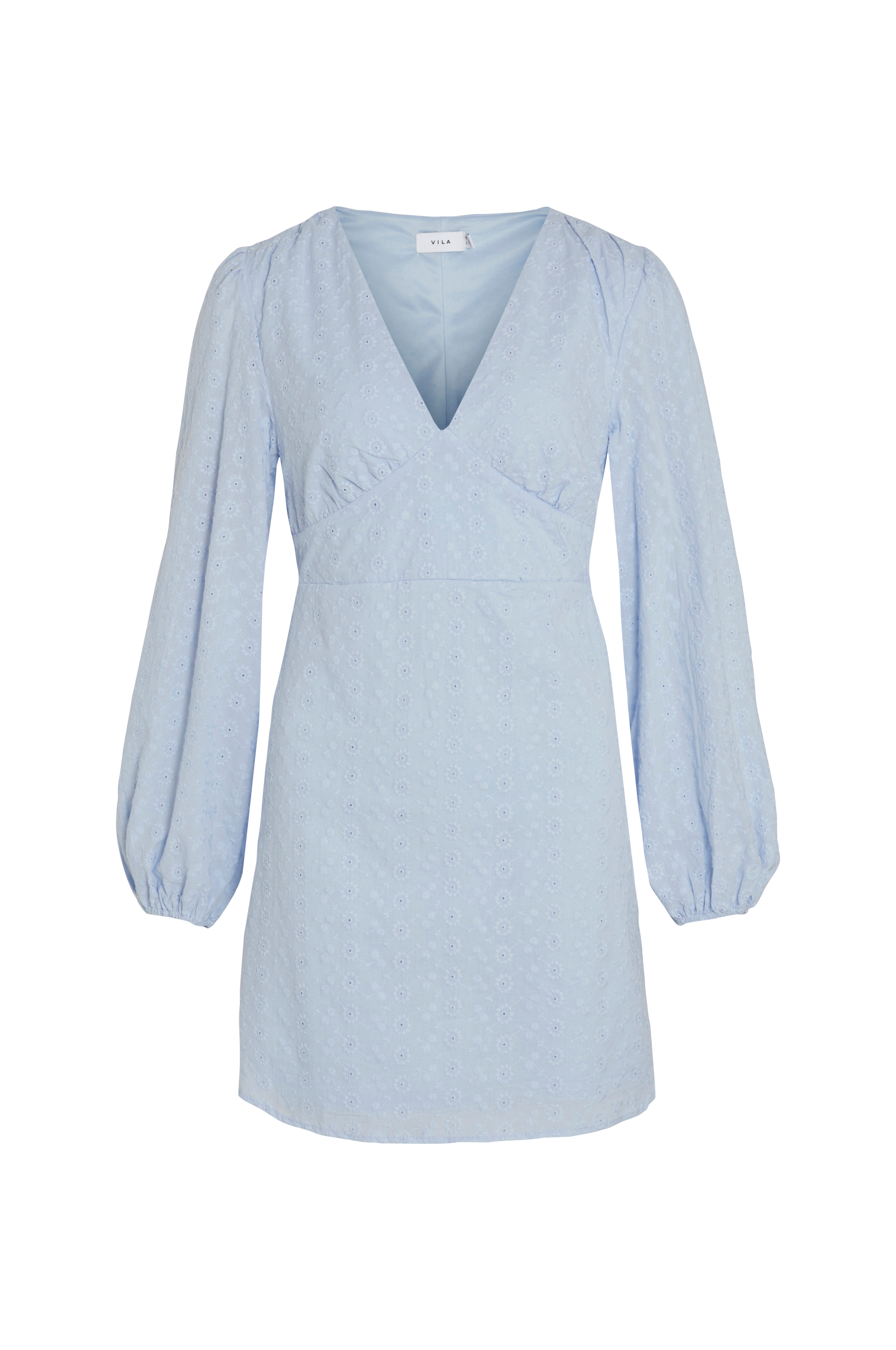 • Kort, figursyet kjole med broderet hulmønster• V-udskæring• Ballonærmer med elastiske manchetter• Elastik bagpå ved taljen• Trikotfor• Længde: 83 cm i størrelse 36