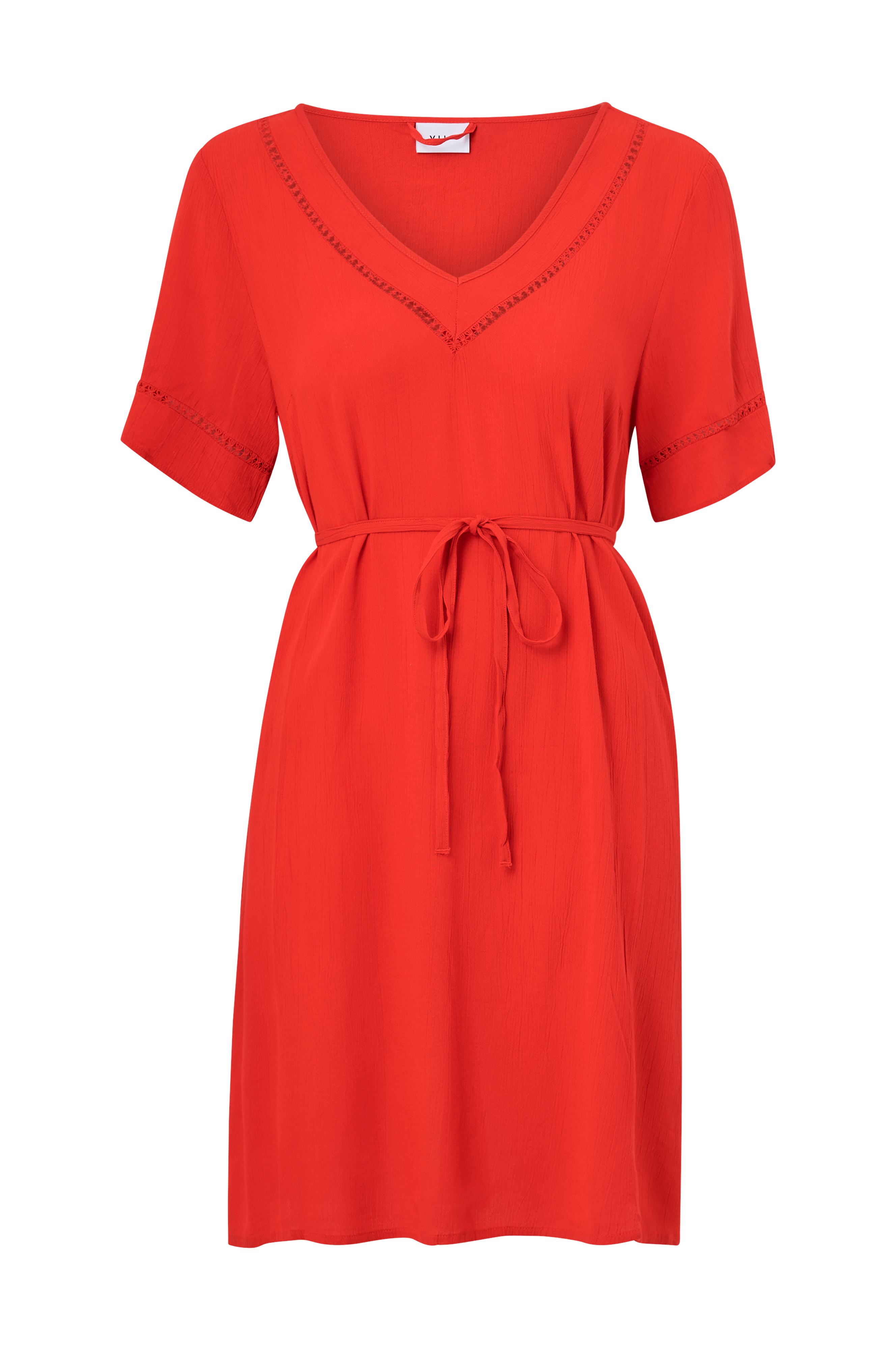 • V-udskæring • Korte ærmer • Lige pasform • Snøring ved taljen • Rynket kvalitet • Længde: 90 cm i størrelse 36 • Produktet indeholder viskose fra Livaeco by Birla Cellulose™, en syntetisk cellulosefiber af træmasse der kommer fra kontrolleret og ansvarsfuldt skovbrug.