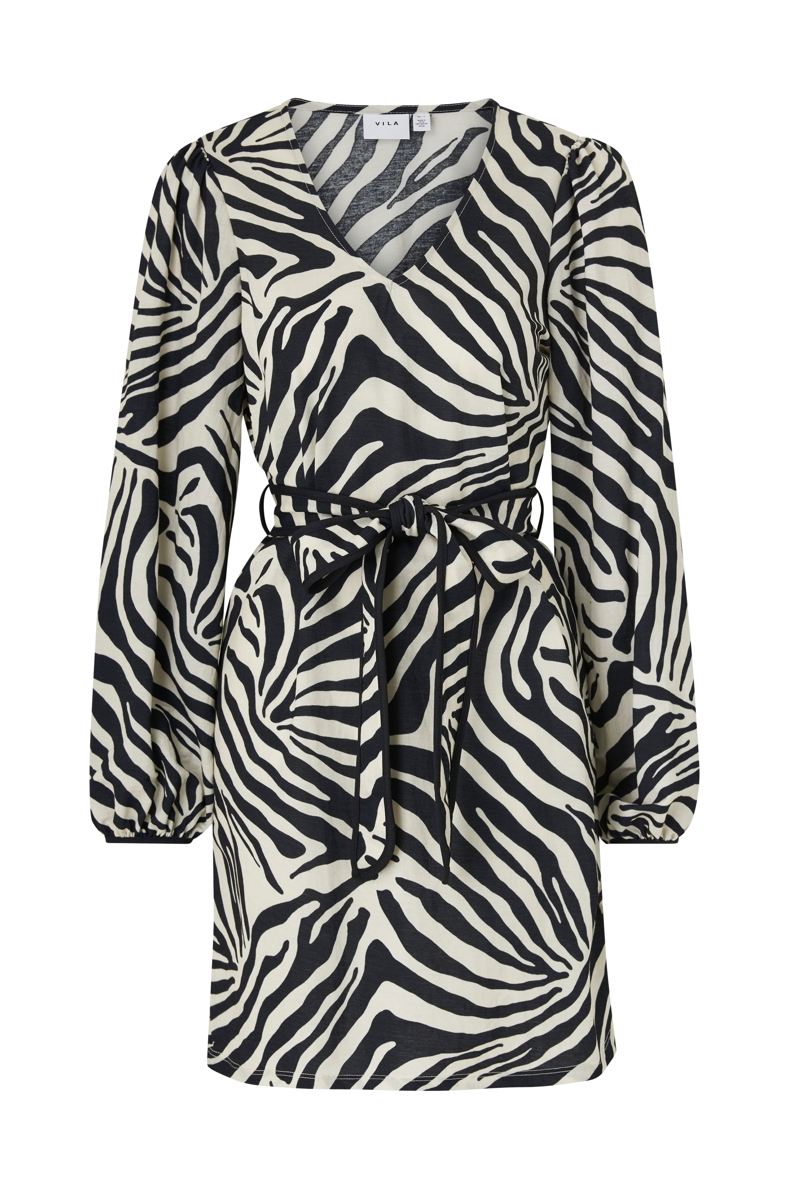 • Zebramønstret kjole• V-udskæring• Kort, lige model• Ballonærmer• Bindebælte• Længde: 90 cm i størrelse S