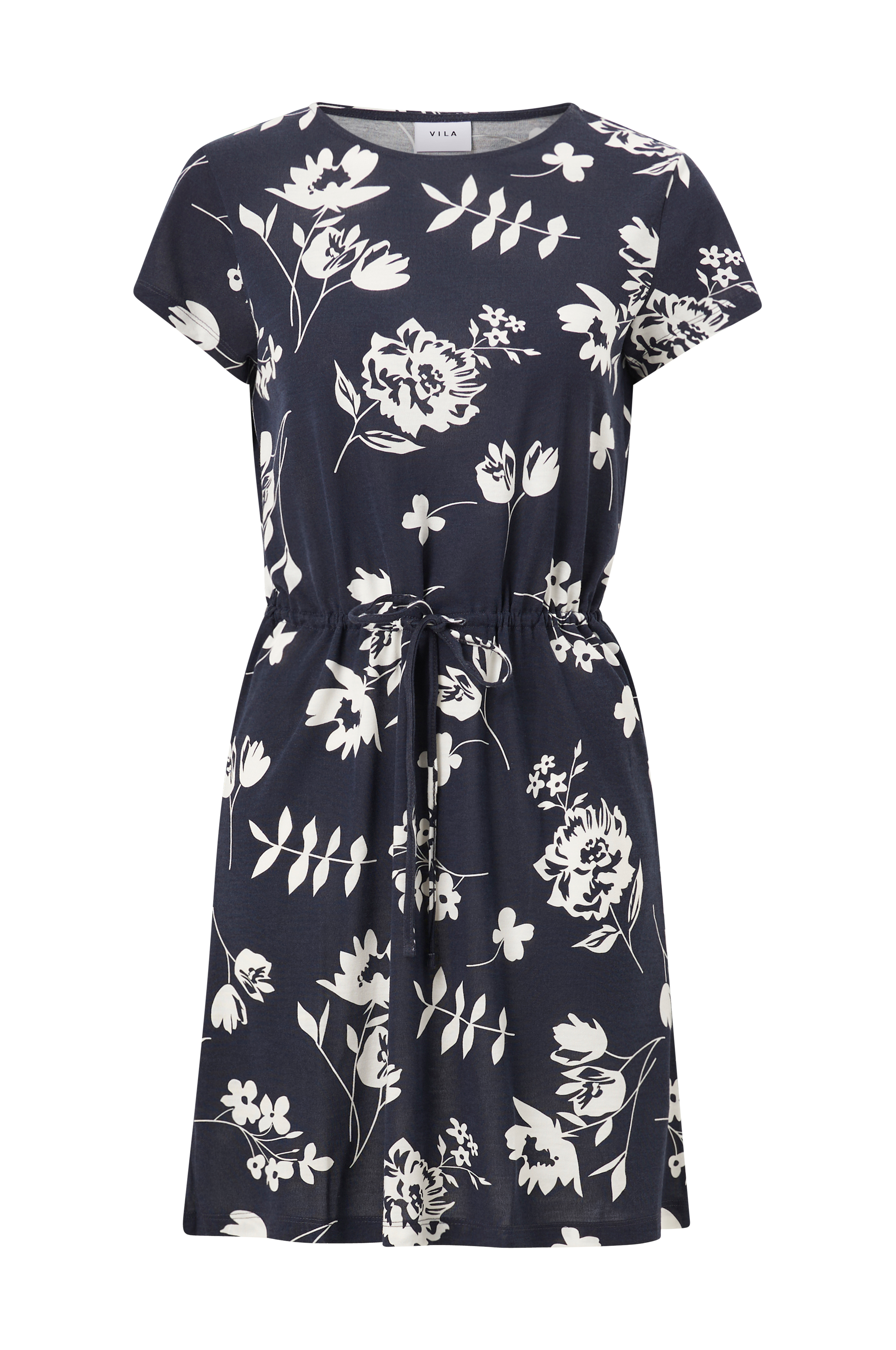 Kjole i blød stretchjersey. Rund hals og kort ærme. Løbegang i taljen. Længde ca. 92 cm i str. S.