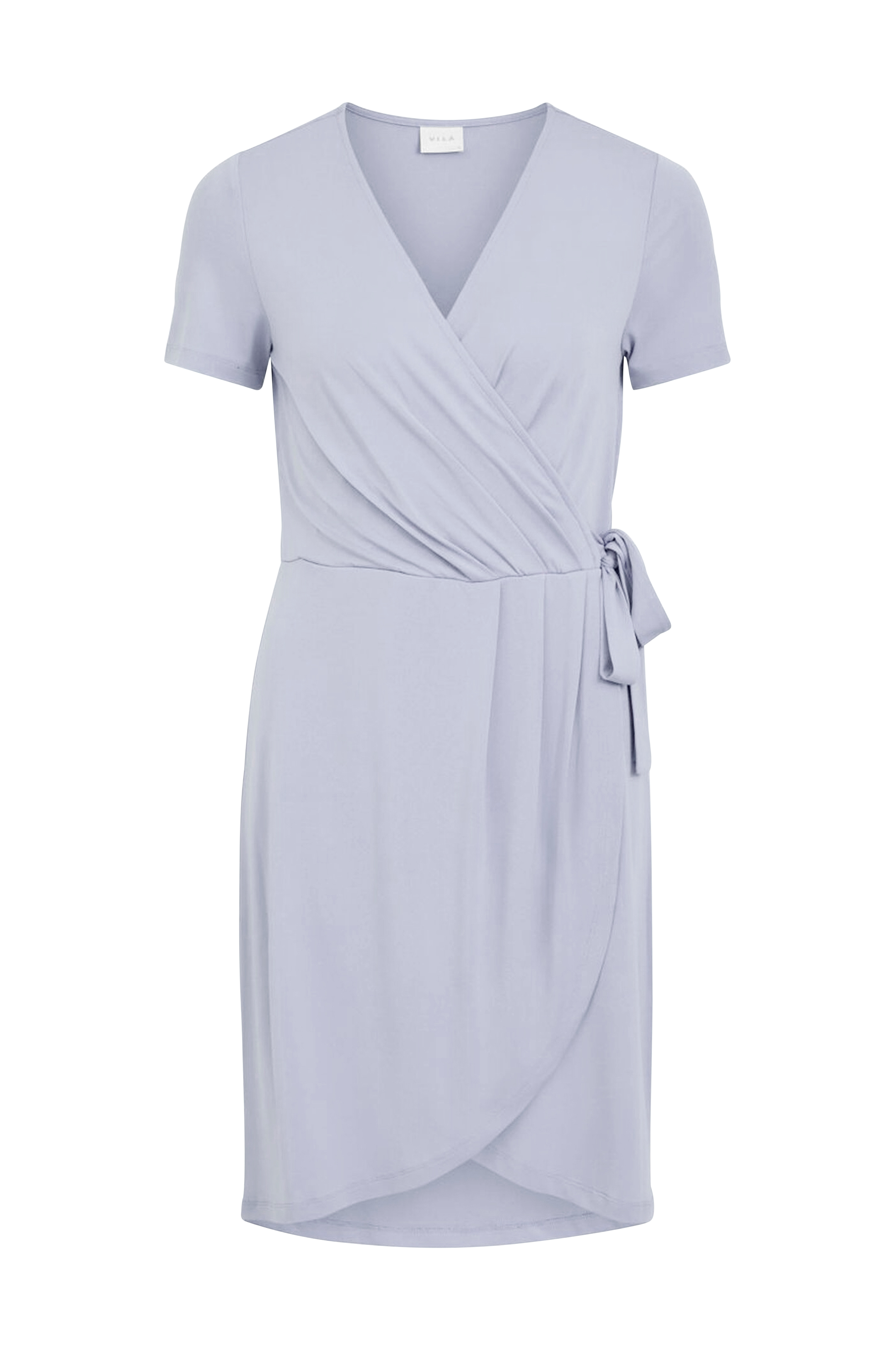 Kjole i jersey. Slå om-kjole med fast talje med lagte læg og bindebånd. Længde ca. 97 cm i str. S.