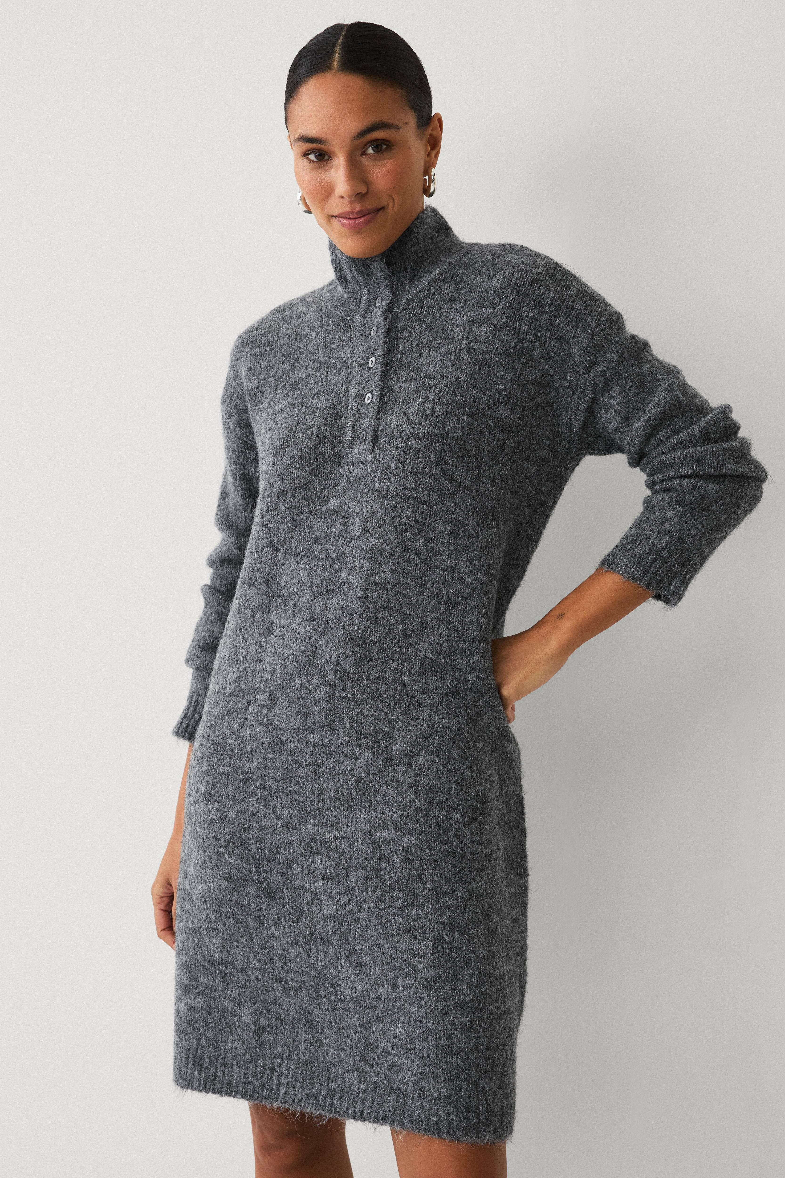 • Fintstrikket kjole med høj, ribbet krave• Kort knaplukning foran oppe foran• Lange ærmer med nedsænkede skuldre• Ribstrik ved manchetterne og ved nederste kant• Længde: 100 cm i størrelse S