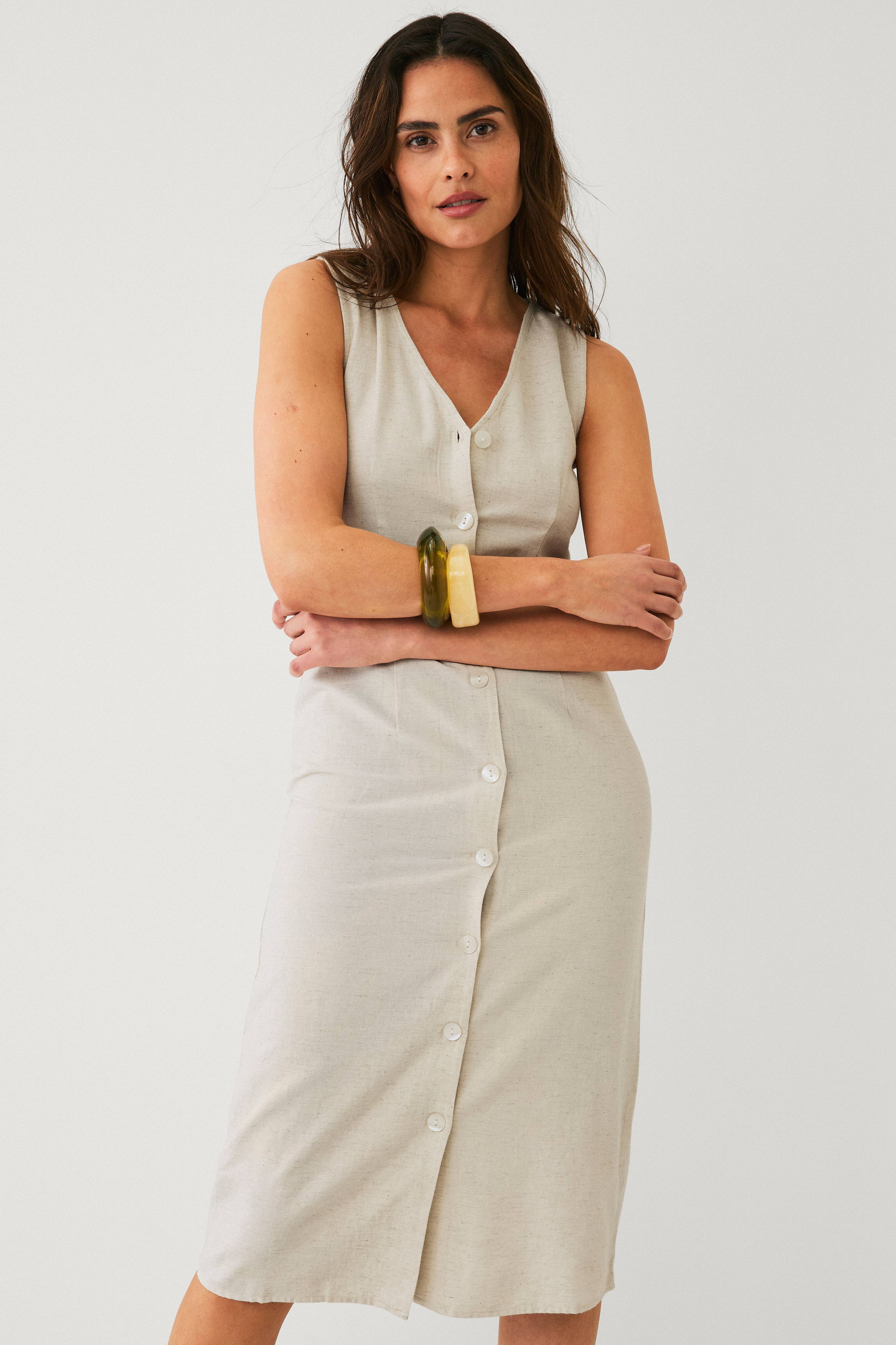 • Ærmeløs model• V-formet halsudskæring• Knapper hele vejen frem• Længde: 116 cm i størrelse 36