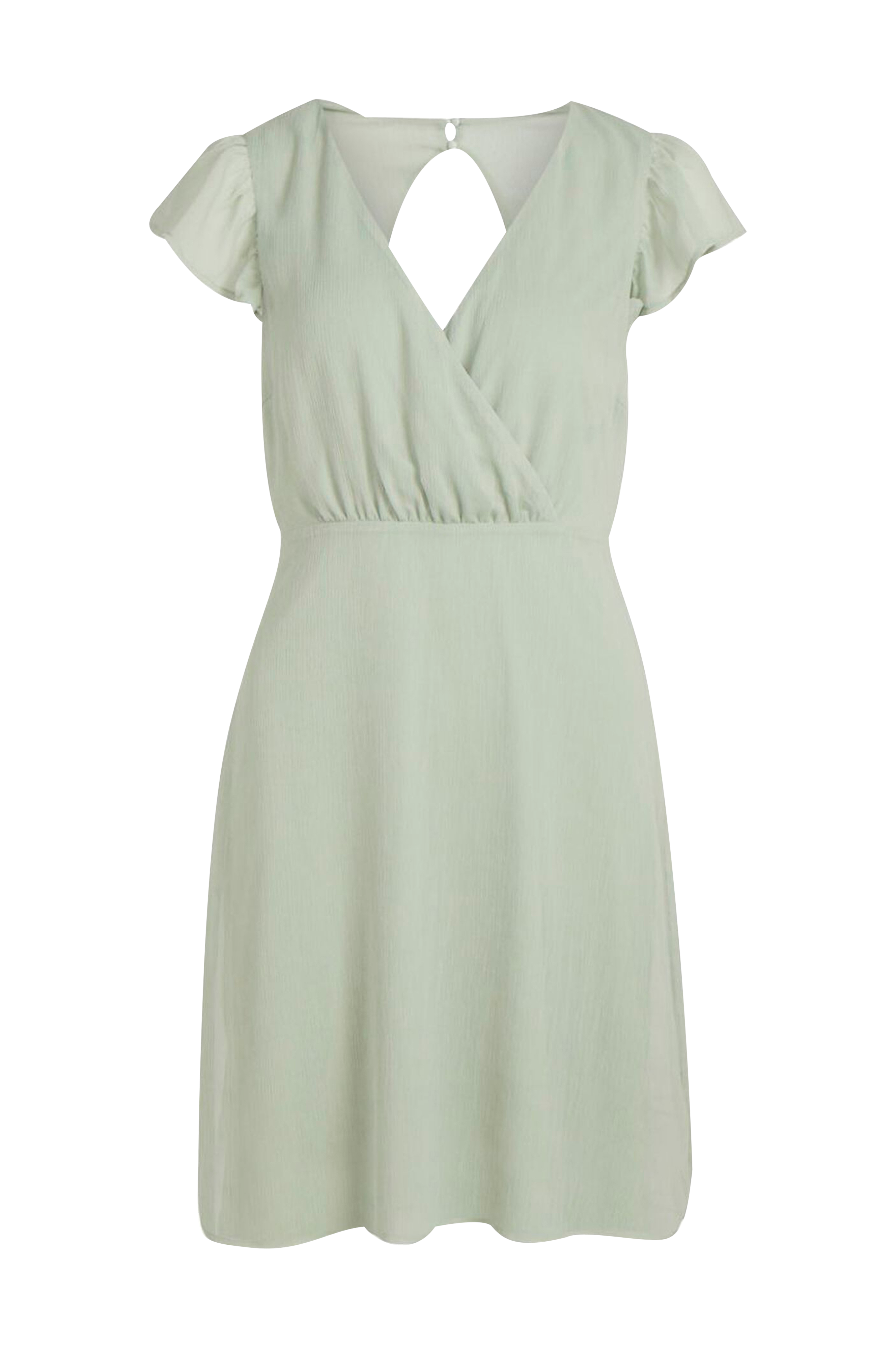 • V-udskæring med slå-om • Korte flagrende ærmer • Åbning i ryggen • Knapper i nakken • Skjult lynlås bagpå • Fremstillet af let krøllet chiffon • Foret • Længde: 91 cm i størrelse 36 • Produktet indeholder genindvundet materiale, som genbruges for at reducere mængden af affald samtidigt med at der ikke anvendes nye ressourcer.