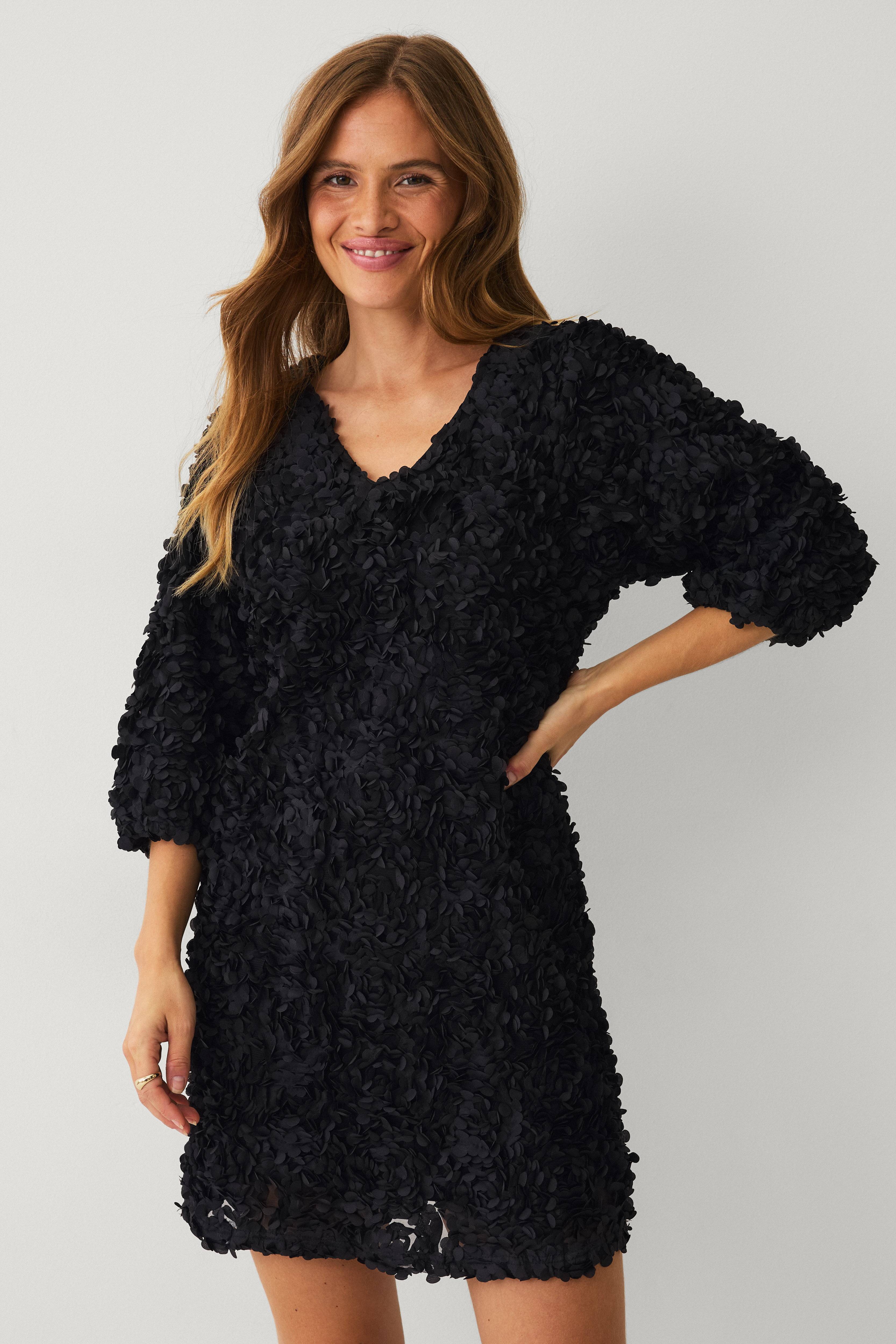 • Kort kjole i mesh med dekorative blomsterdetaljer overalt• V-udskæring• 2/4 længdee ærmer• Tekstilforing• Normal pasform• Længde: 90 cm i størrelse 36