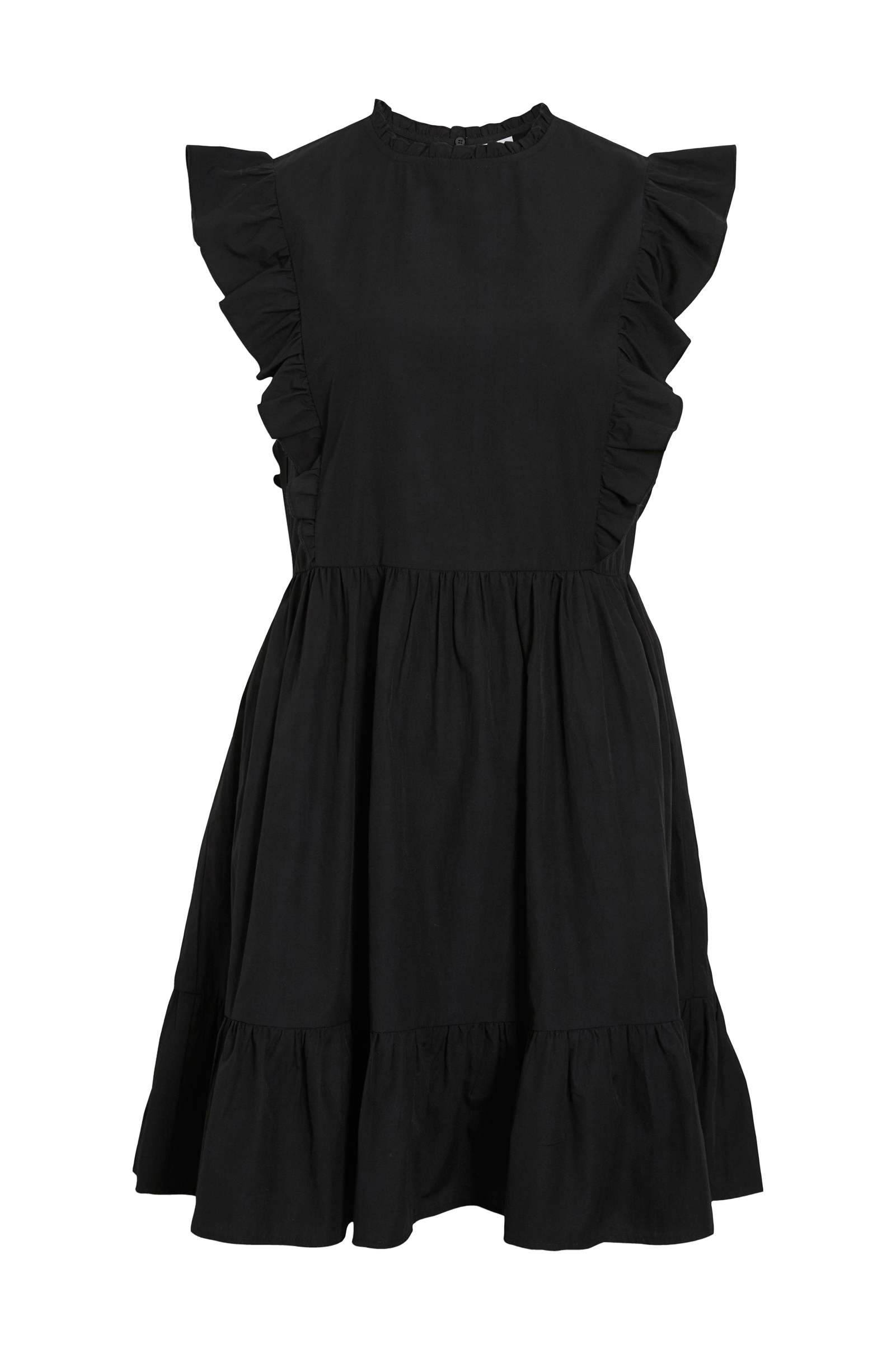 • Ærmeløs kjole med volanter over skuldrene• Rund halsudskæring med flæsekrave• Nøglehulslukning i nakken• Rynket udskæring ved taljen• Volant ved nederste kant• Længde: 93 cm i størrelse 36