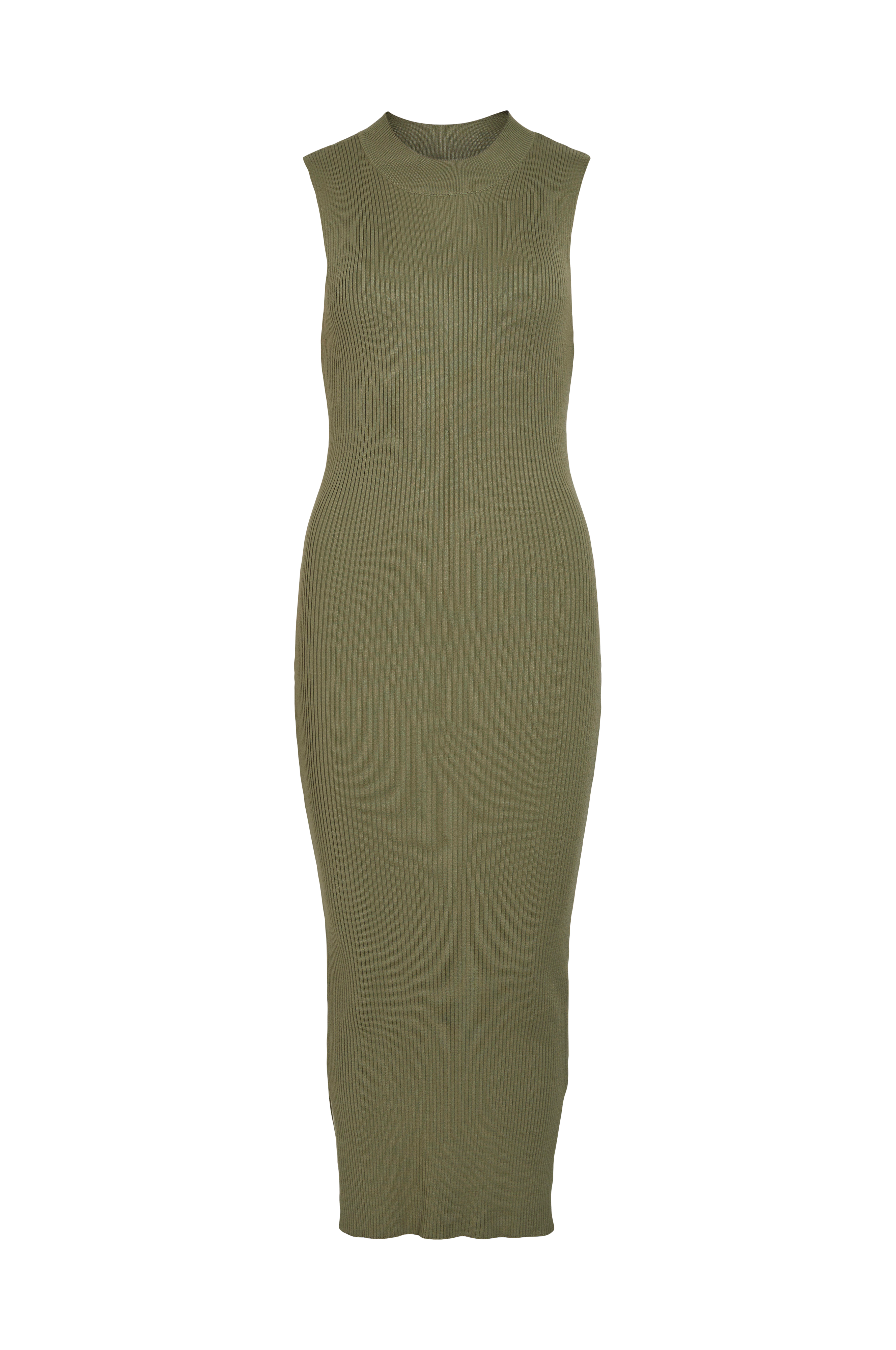 • Figursyet, ribstrikket, ærmeløs model• Høj, ribbet krave• Korte slidser nede i siderne• Længde: 126 cm i størrelse S