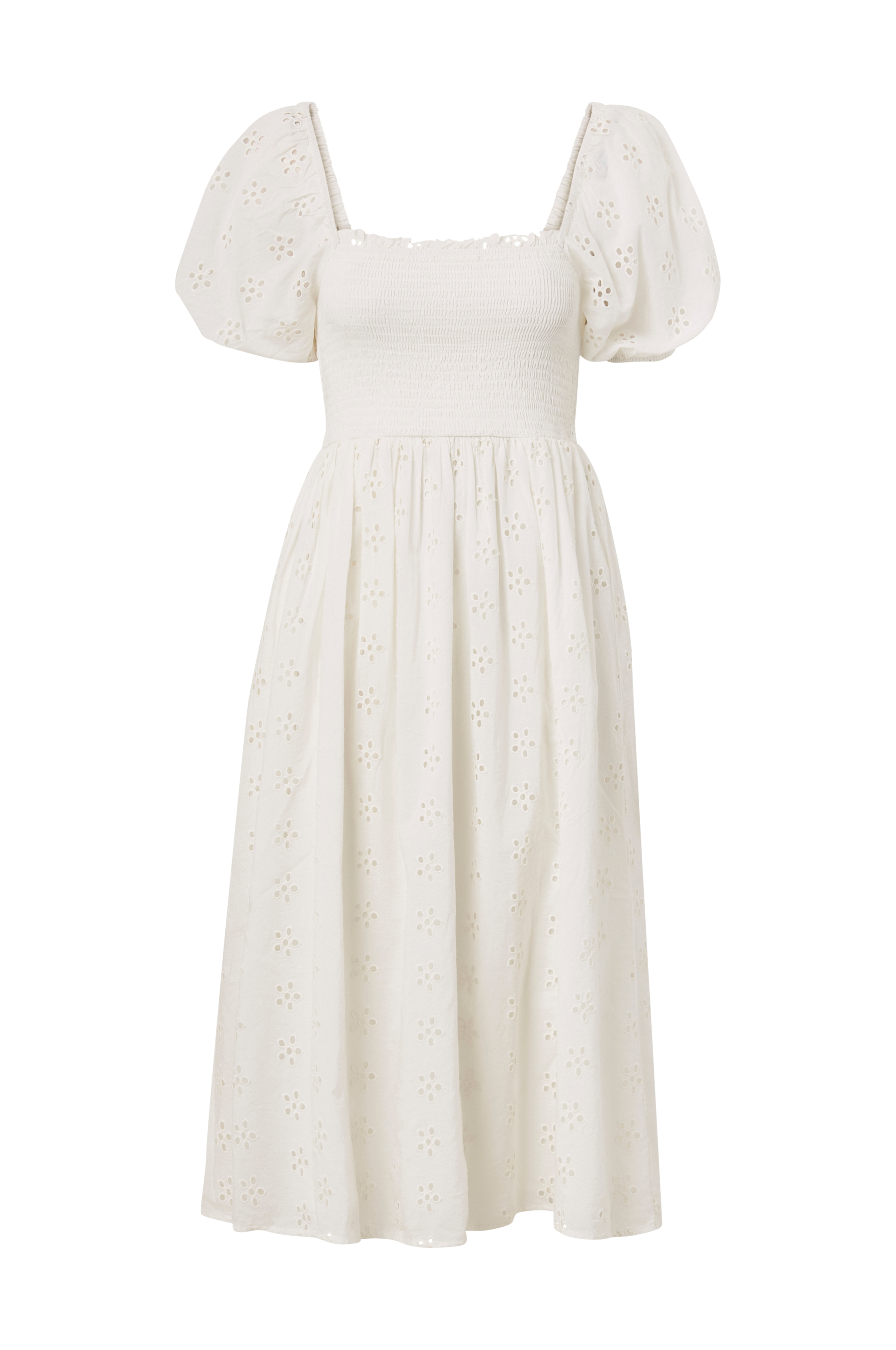 • Smocket øvre del• Firkantet halsudskæring• Ballonærmer• Broderet hulmønster• Længde: 110 cm i størrelse 36