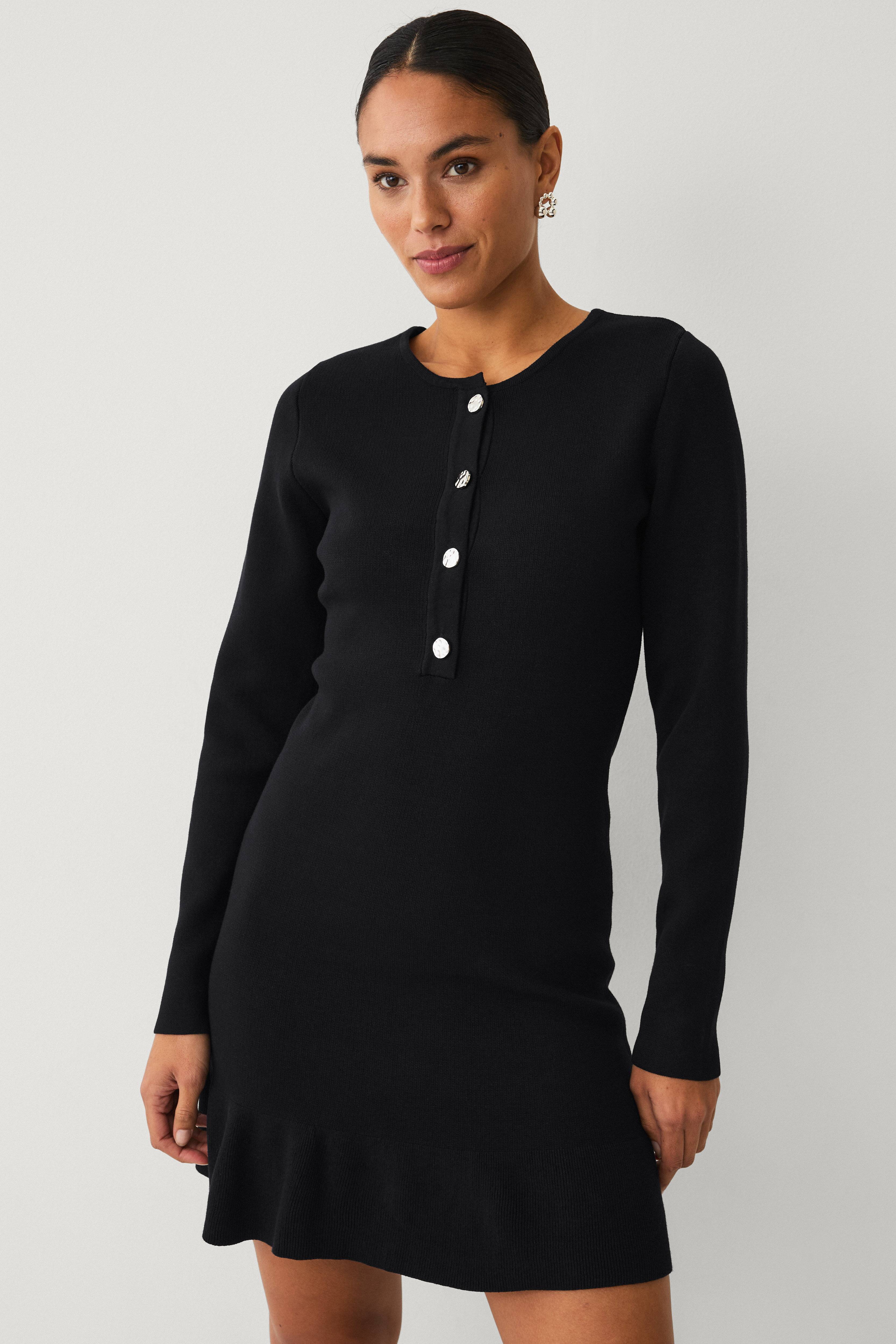 • Kort, fintstrikket kjole• Rund halsudskæring• Kort knaplukning foran med dekorative knapper• Lange ærmer• Volant ved nederste kant• Længde: 87 cm i størrelse S