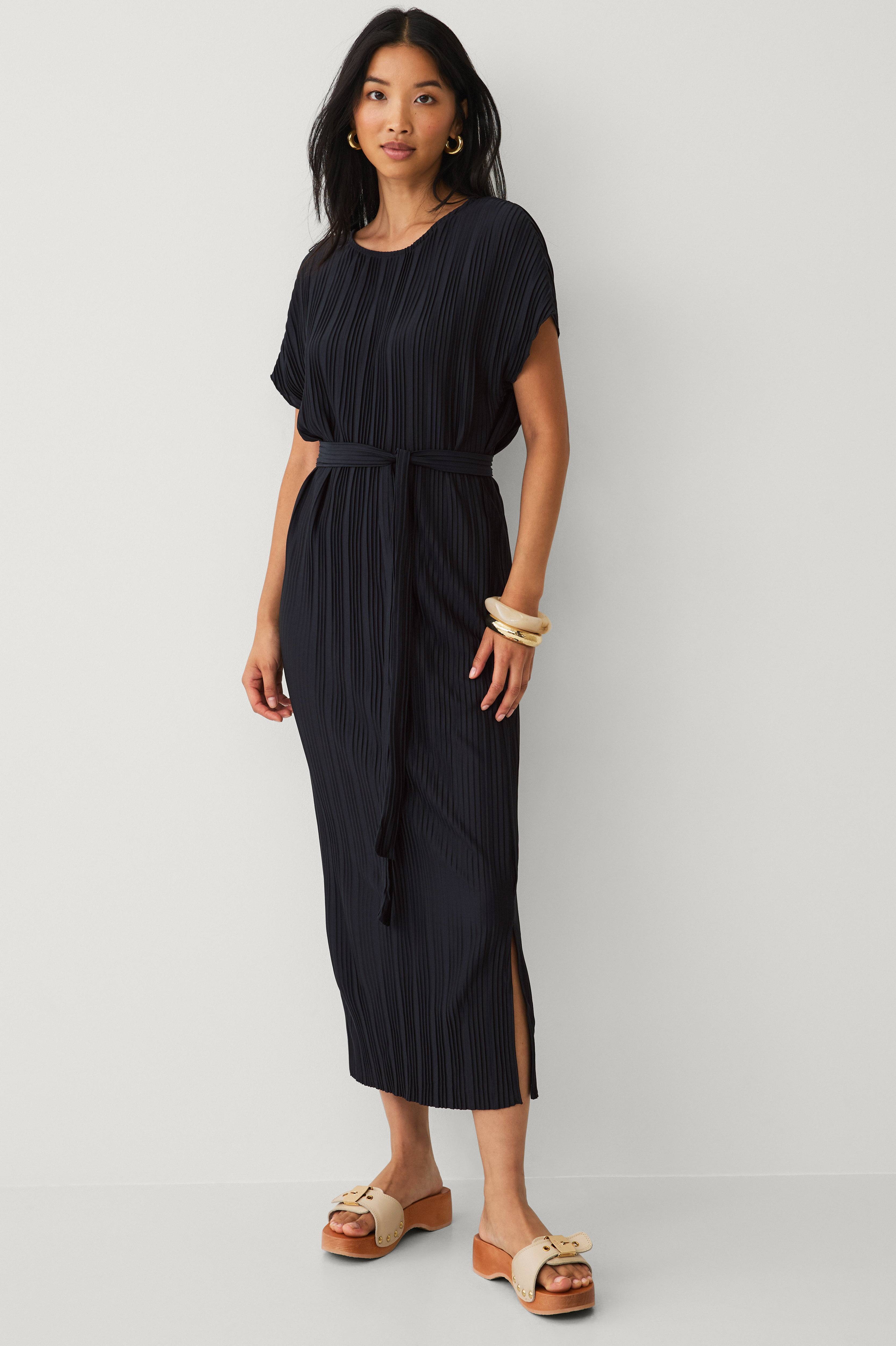 • Plisseret kjole• Rund halsudskæring• Korte ærmer• Aftageligt bindebånd ved taljen• Slids nederst i den ene side• Normal pasform• Længde: 126 cm i størrelse S
