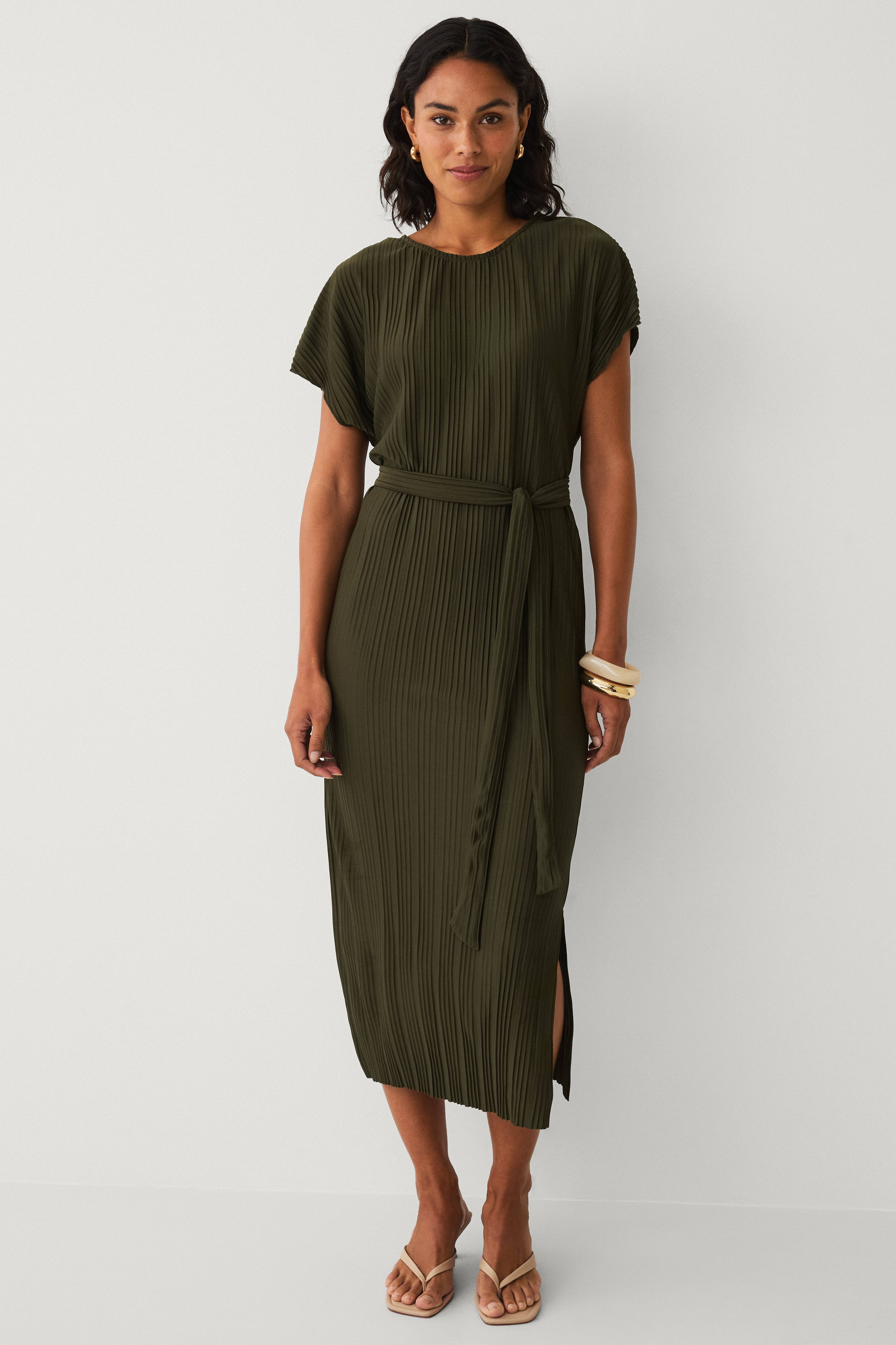 • Plisseret kjole• Rund halsudskæring• Korte ærmer• Aftageligt bindebånd ved taljen• Slids nederst i den ene side• Normal pasform• Længde: 126 cm i størrelse S
