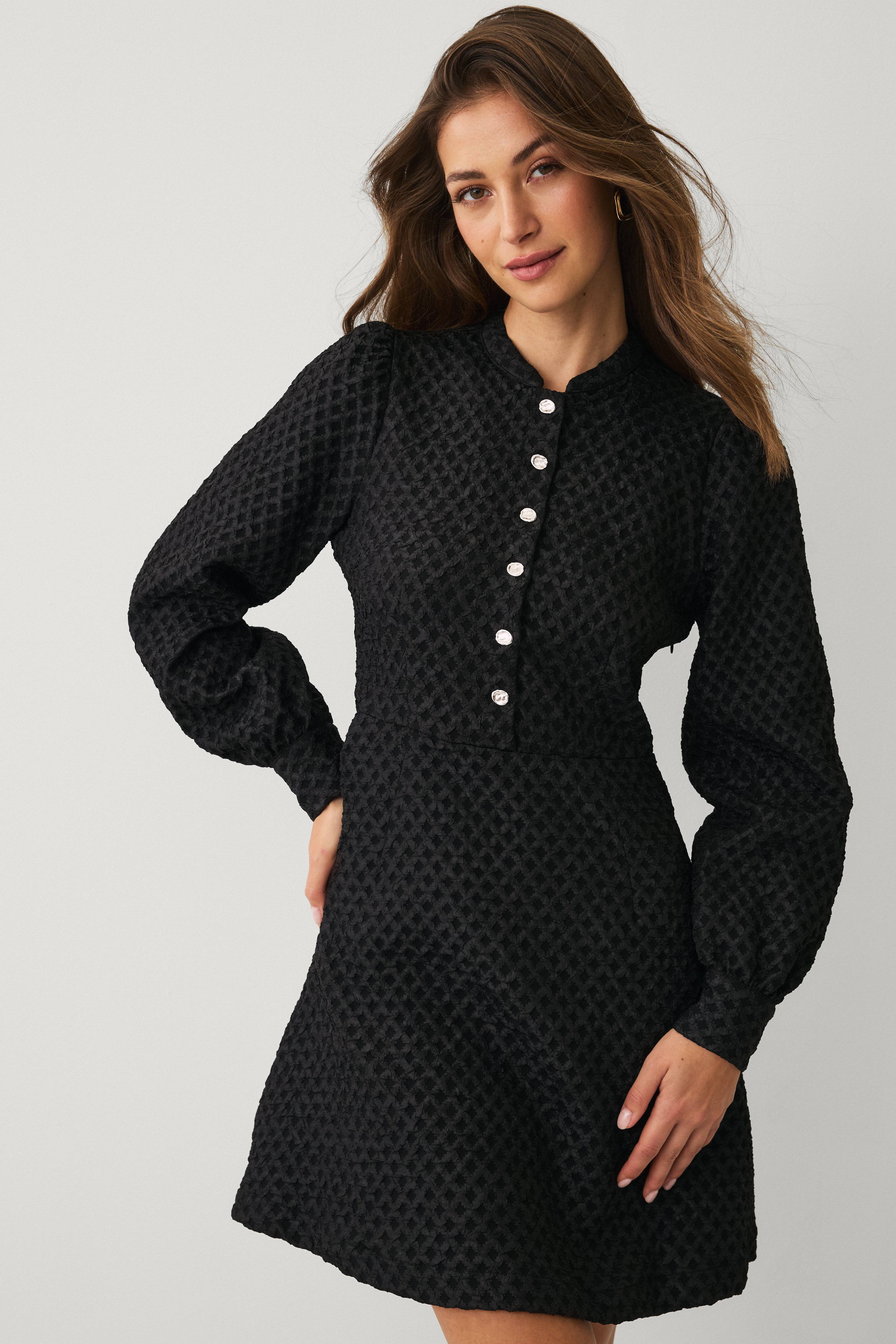 • Jacquardvævet kjole med struktur• Rund halsudskæring• Dekorative knapper oppe foran• Lange ballonærmer med manchet ved manchetterne• Defineret talje• Nederdel med svaj• Længde: 90 cm i størrelse 36